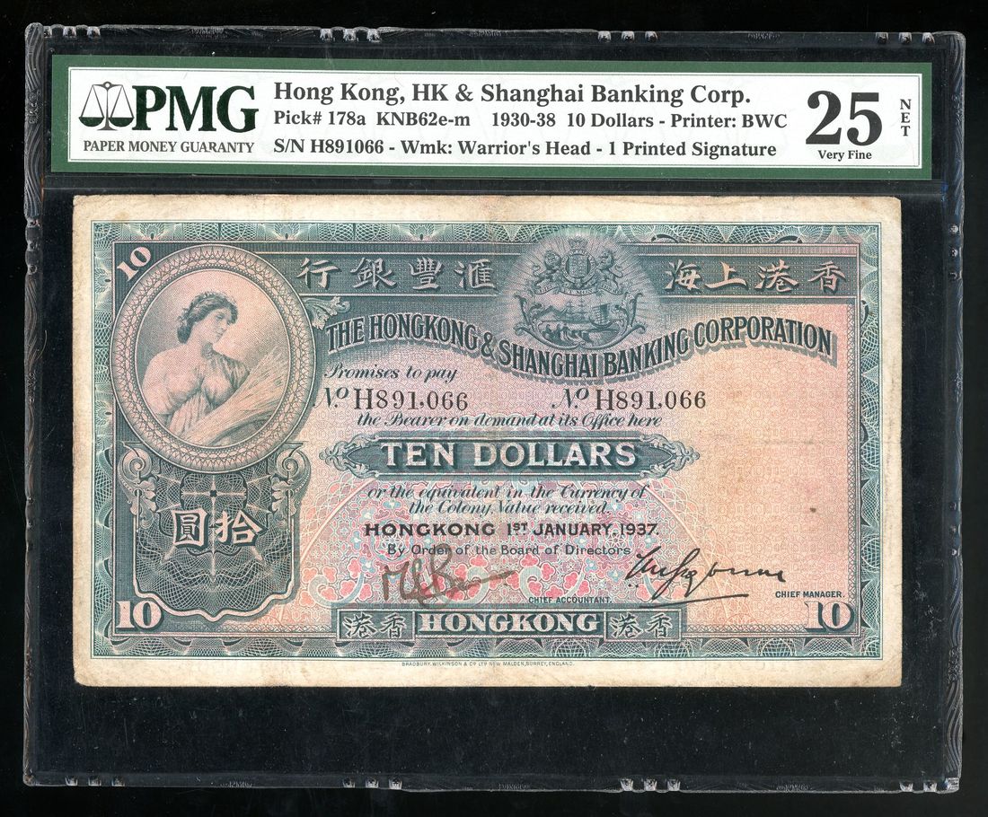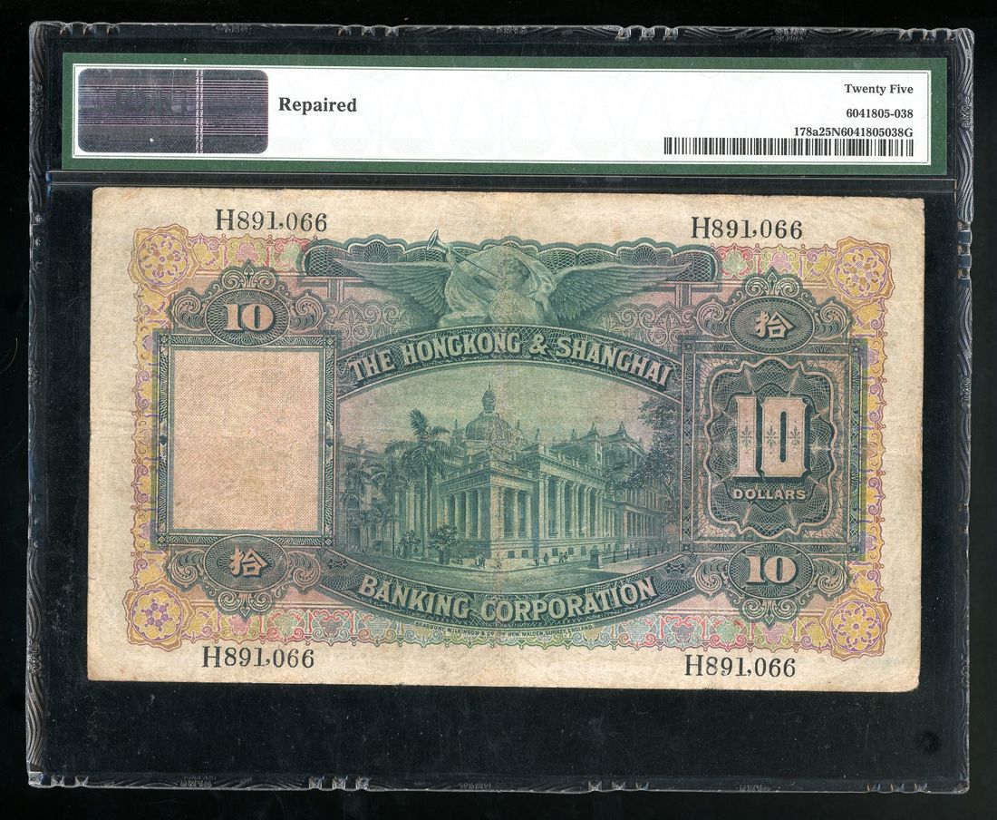 HongKong & Shanghai Banking Corporation, $10, 1.1.1937, serial number H891,066, (Pick 178a), PMG 25NET, repaired.