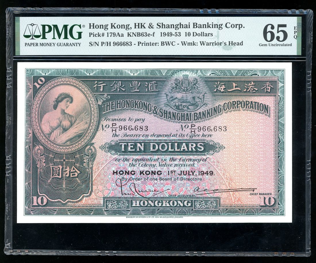 HongKong & Shanghai Banking Corporation, $10, 1.7.1949, serial number P/H 966,683, (Pick 179Aa), PMG 65EPQ