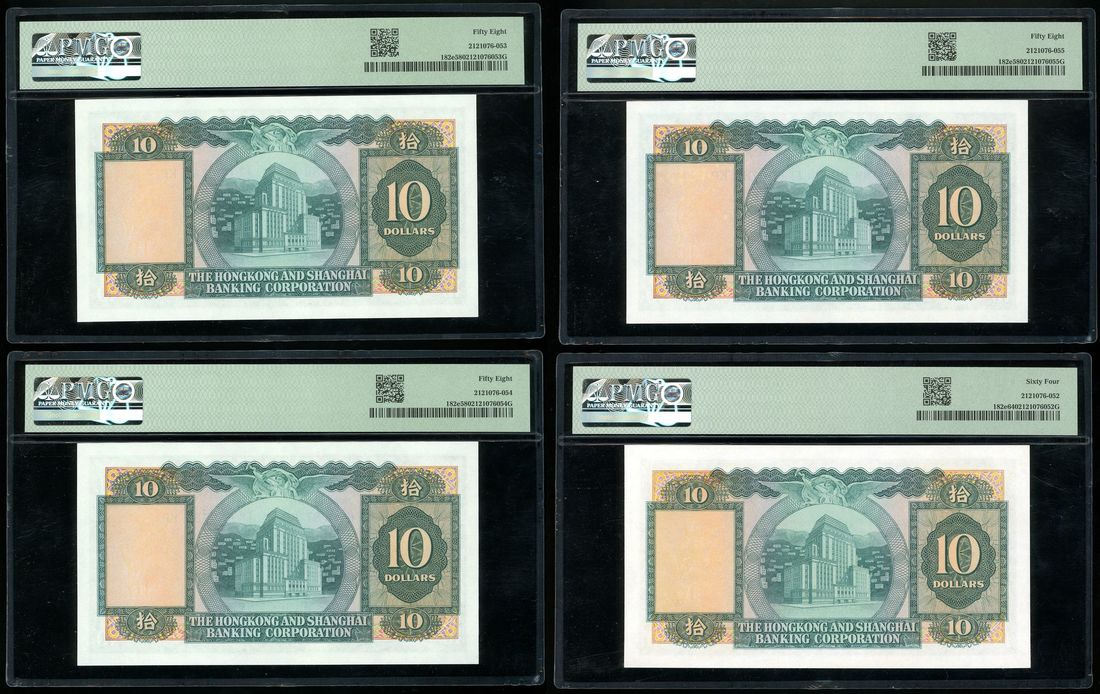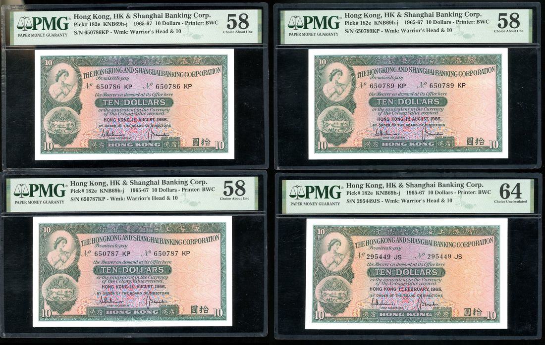 Hongkong & Shanghai Banking Corporation, a group of 4x $10, 1.2.1965 and 1.8.1966, serial numbers 295449 JS, 650786/87/89 KP,