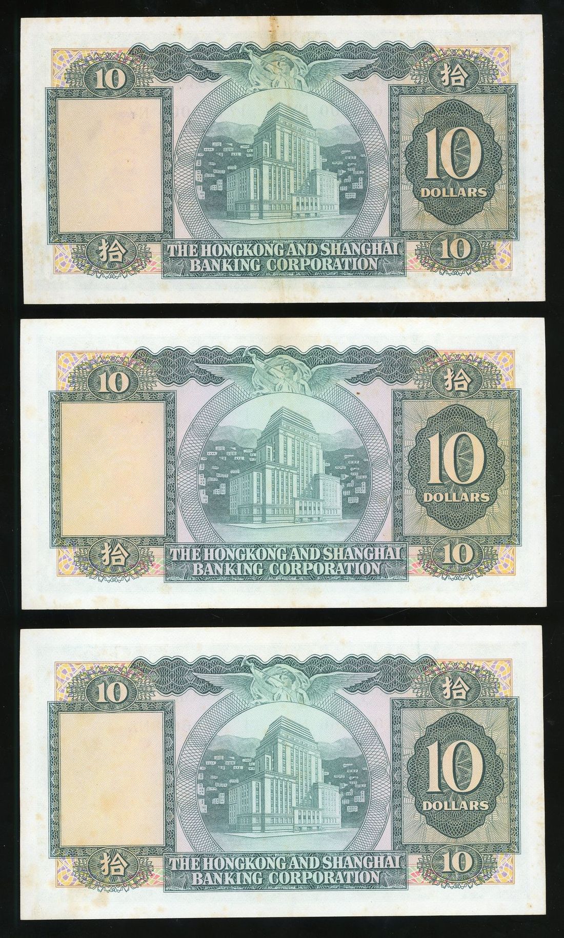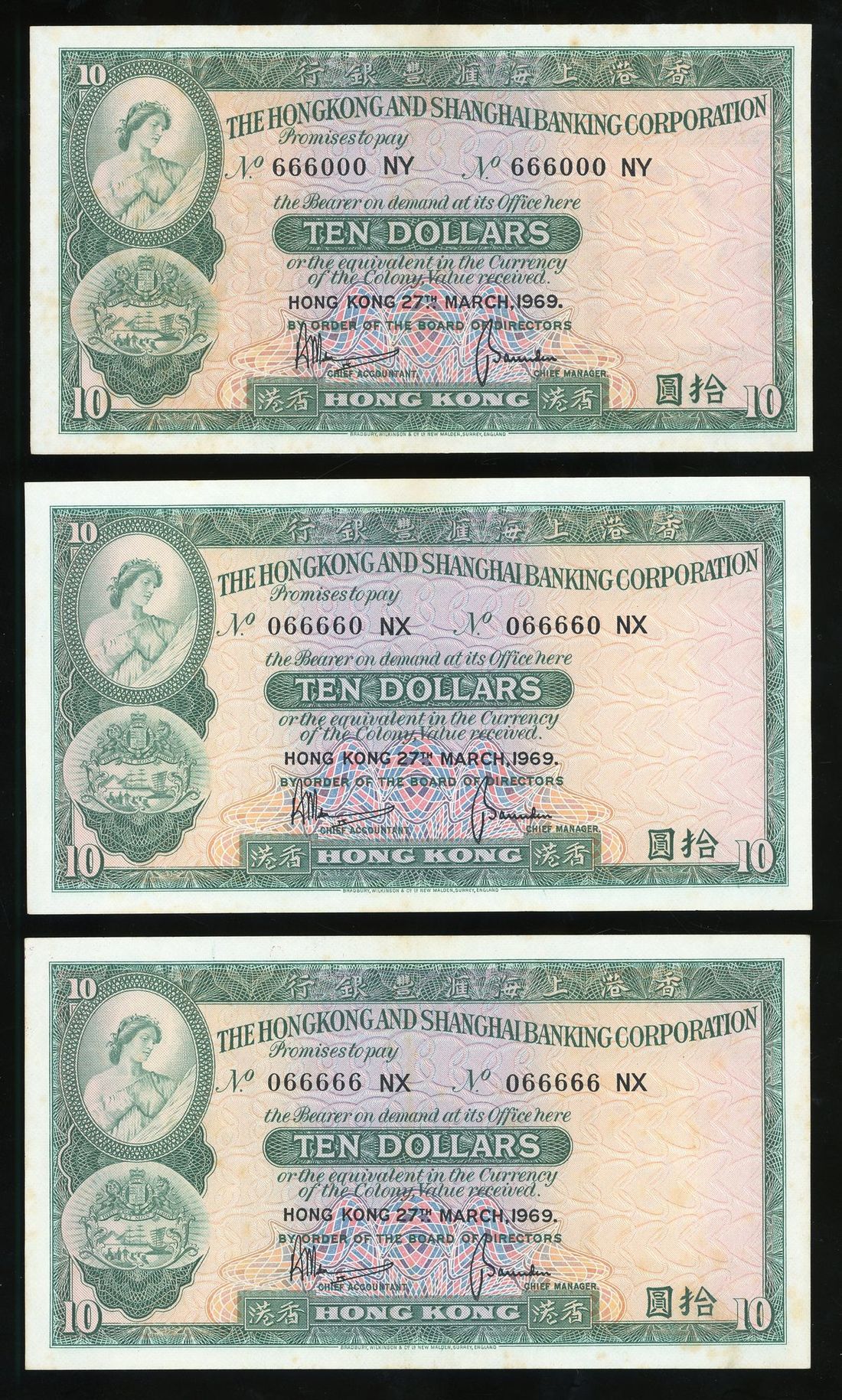 HongKong & Shanghai Banking Corporation, a group of 3x fancy serial number $10, 1969, serial nnumbers 066666NX, 066660NX, 666000NY, (Pick 182f), all foxed extremely fine. Interesting group (3)