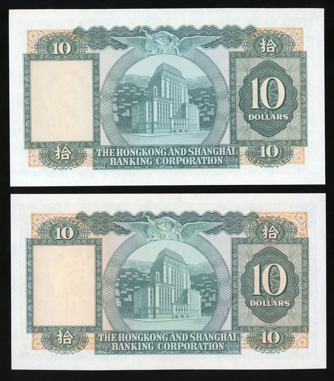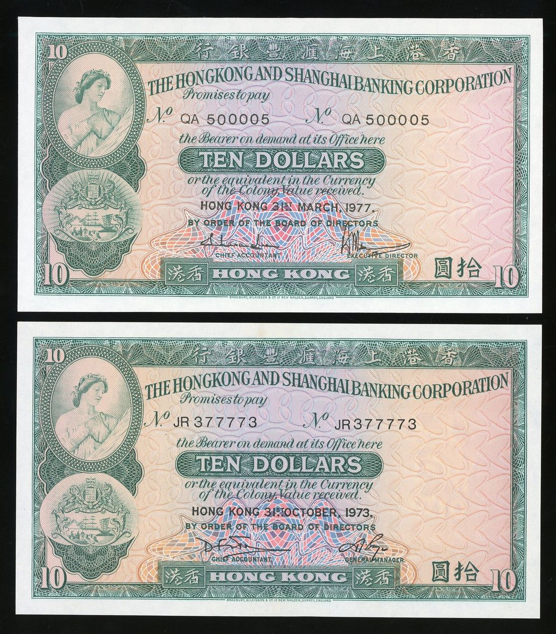 HongKong & Shanghai Banking Corporation, a pair of radar serial numbers $10, 1973, 1977, including JR377773, QA500005, (Pick 182), foxed, about uncirculated (2)
