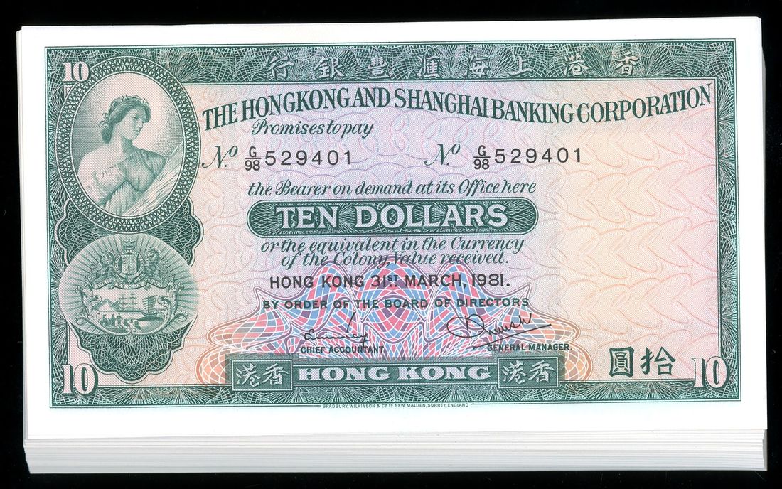 HongKong & Shanghai Banking Corporation, consecutive bundle of $10 (100), 31.3.1981, serial numbers G/98 529401-500, (Pick 182i), some handling on first and last note, otherwise well kept uncirculated (100)
