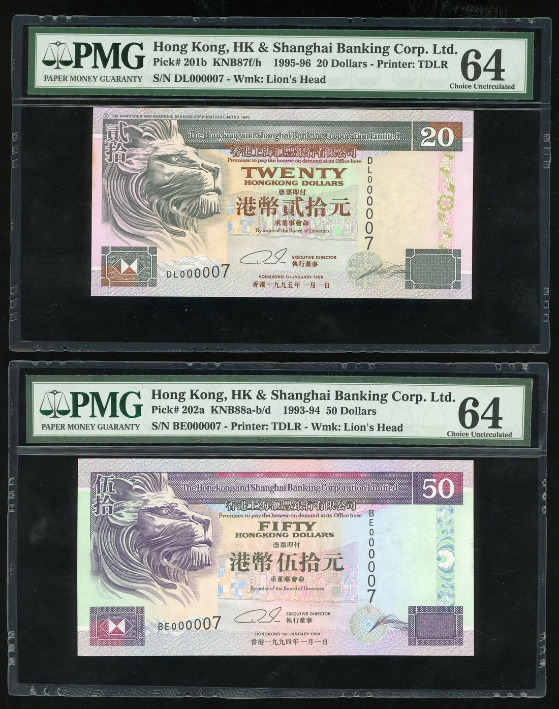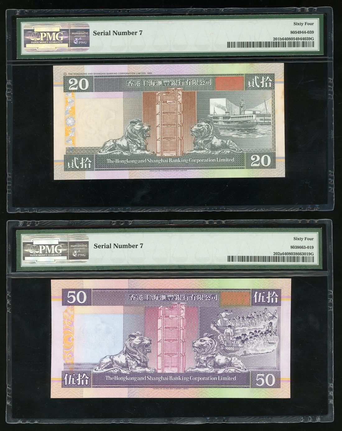 HongKong & Shanghai Banking Corporation, a pair of matching serial number 000007, 1994/55, $20, $50, (Pick 201b, 202a), both PMG 64 (2)