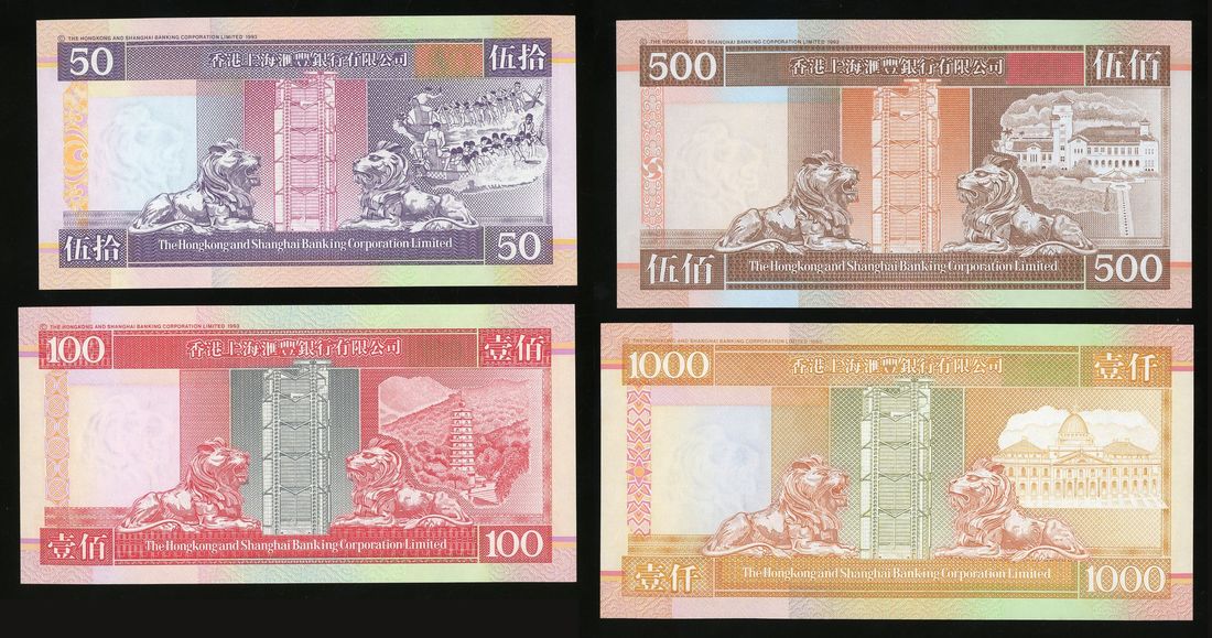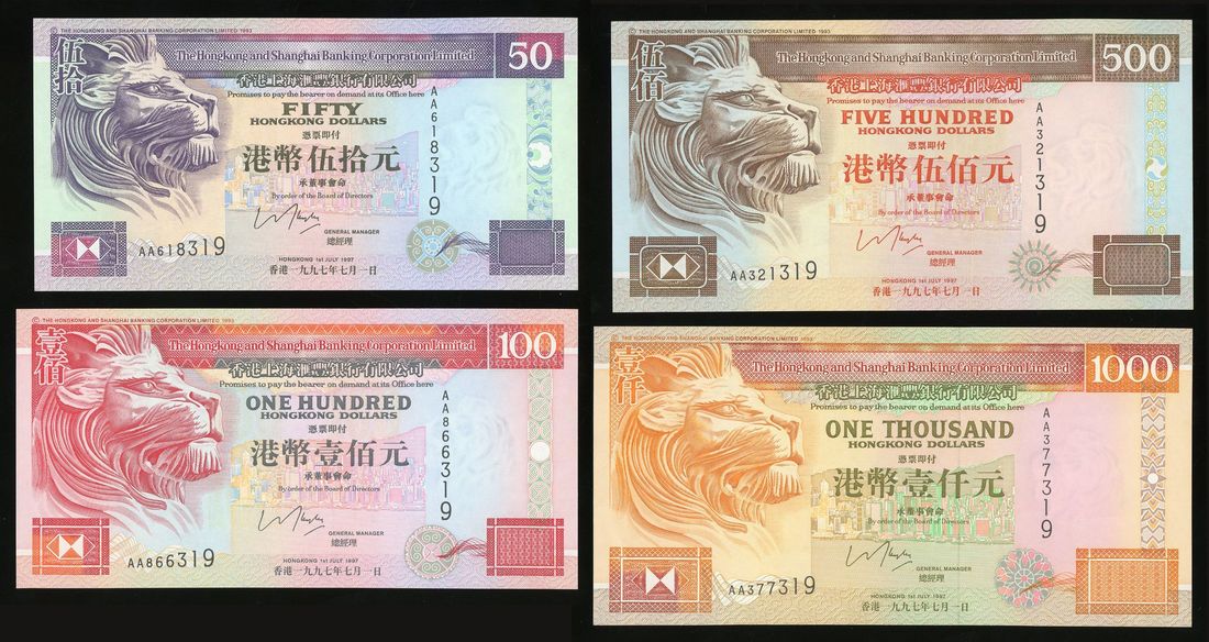 HongKong & Shanghai Banking Corporation, a set of 1997 issue, all with AA prefix, serial number ending 319, includes $50, $100, $500, $1000, (Pick 202-205), uncirculated (4)
