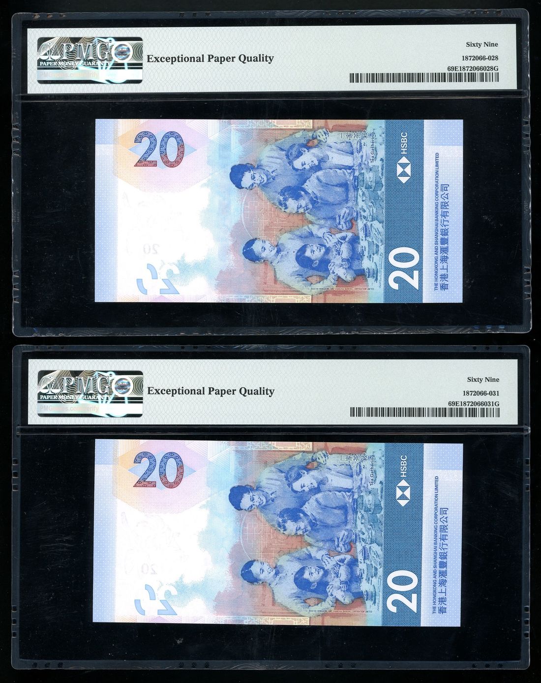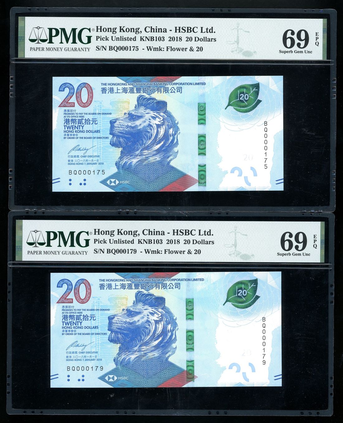 Hongkong & Shanghai Banking Corporation, a pair of $20, 1.1.2018, low serial numbers BQ 000175/79, (Pick 218a), both graded PMG 69EPQ (2)