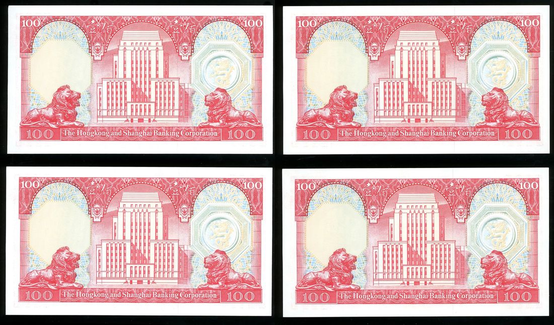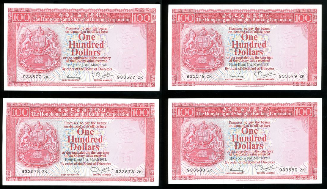 Hongkong and Shanghai Banking Corporation, a consecutive group of 4x $100, 31.3.1981, serial numbers 933577-80 ZK,