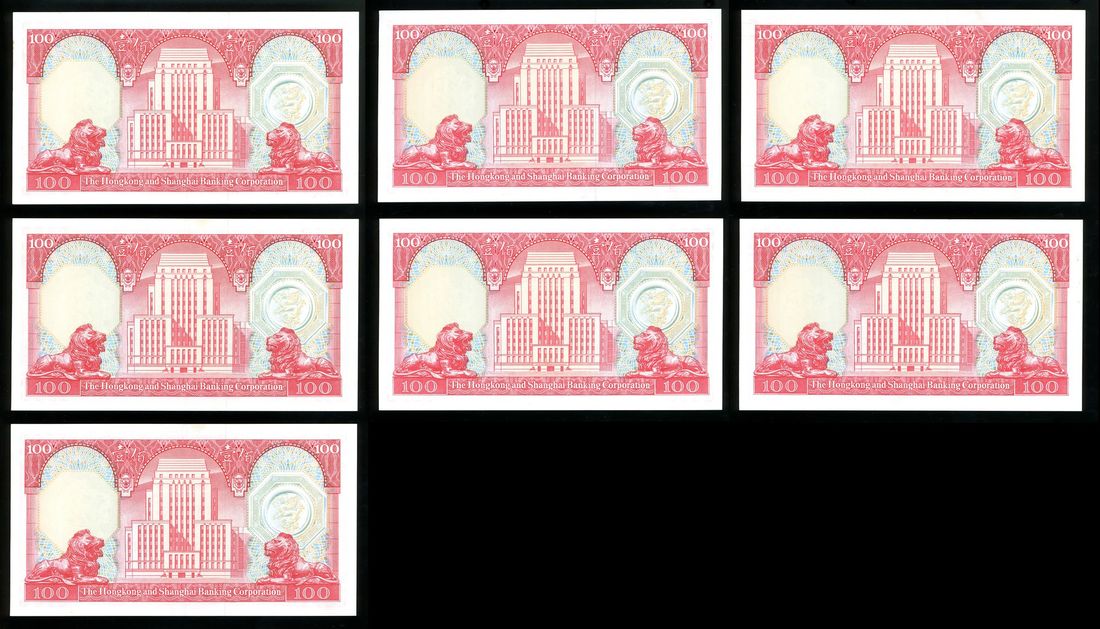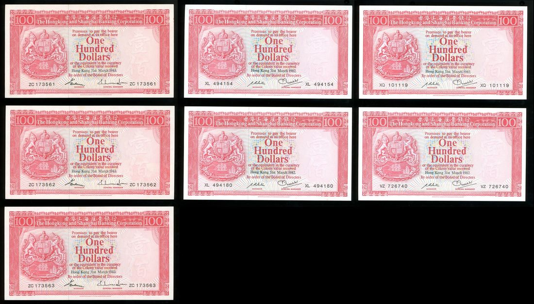 Hongkong and Shanghai Banking Corporation, a group of 7x $100, including: 4x 31.3.1982 and 3x 31.1.1983, 1983 issue with consecutive serial numbers ZC 173561-63,