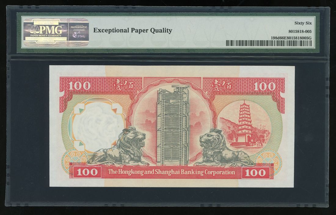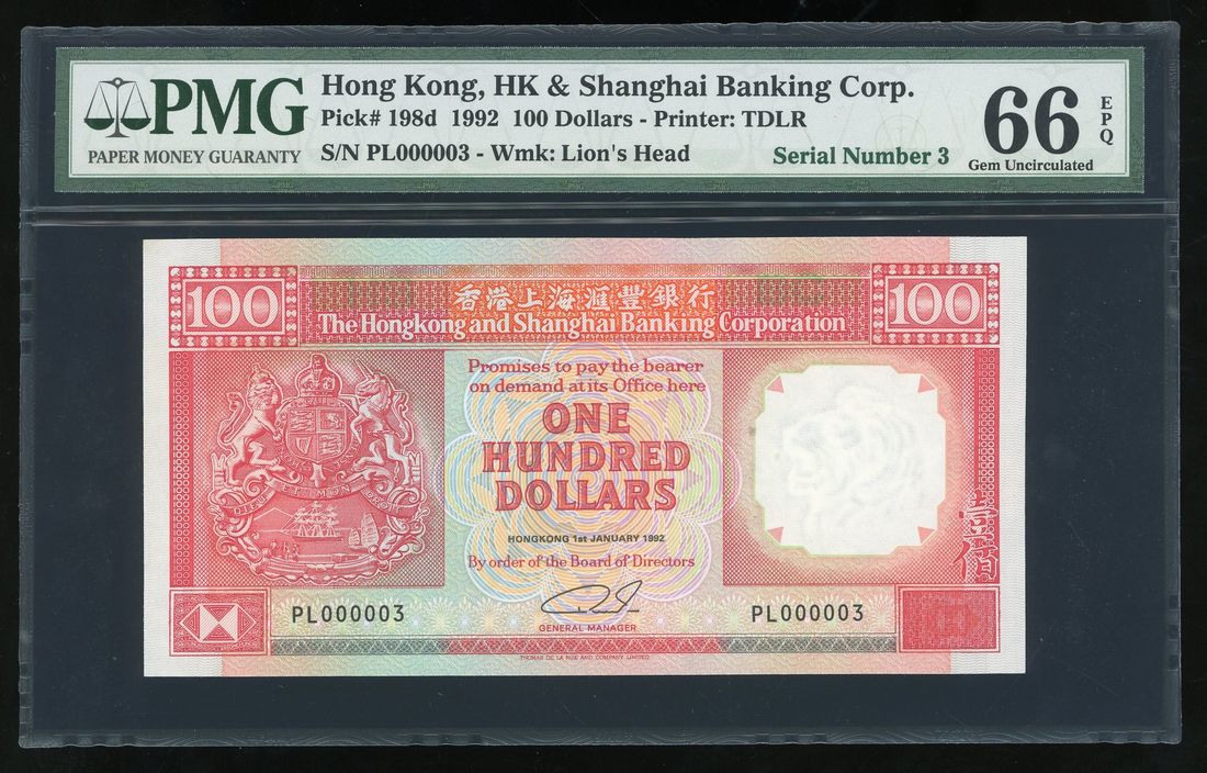HongKong & Shanghai Banking Corporation, $100, 1.1.1992, low serial number PL000003, (Pick 198d), PMG 66EPQ