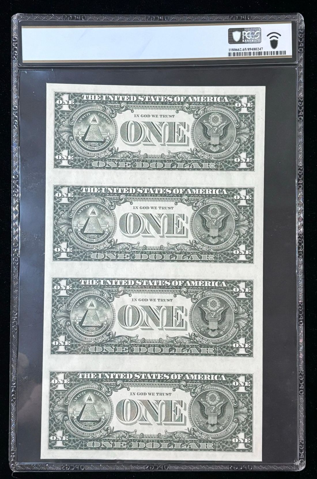 United States, Federal Reserve Note, Boston an uncut sheet of 4X, $1, 1985, serial number A99982419A, A99987419A, A99992419A, A99997419A, (Fr.# 1913A),