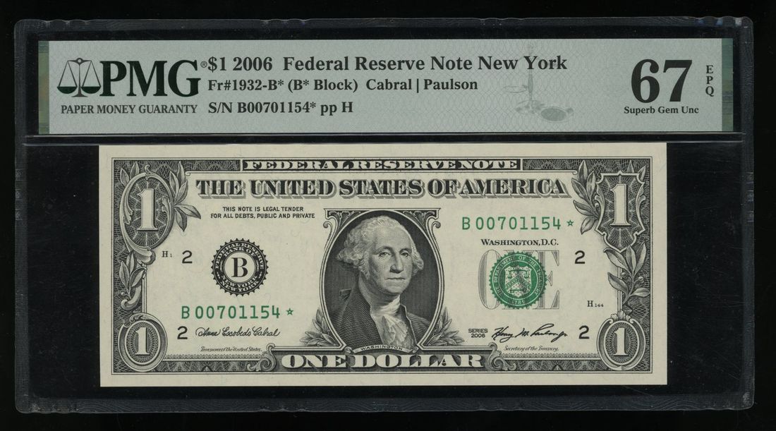 Federal Reserve Note New York, United States of America, replacement $1, 2006, serial numbers B00701154* pp H, signatures by Cabral and Paulson,