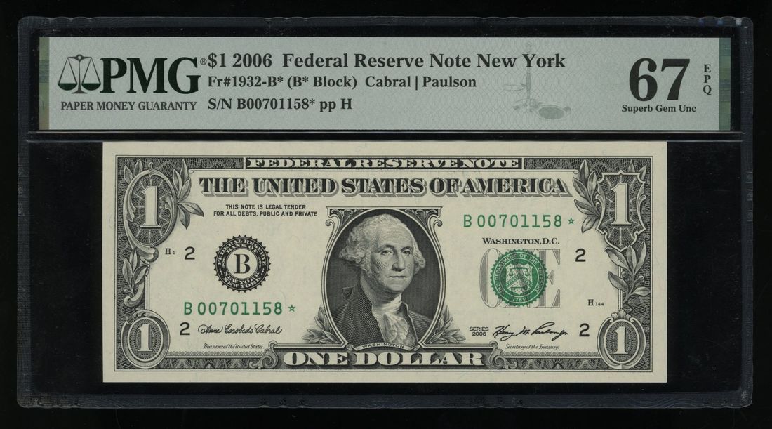 Federal Reserve Note New York, United States of America, replacement $1, 2006, serial numbers B00701158* pp H, signatures by Cabral and Paulson,