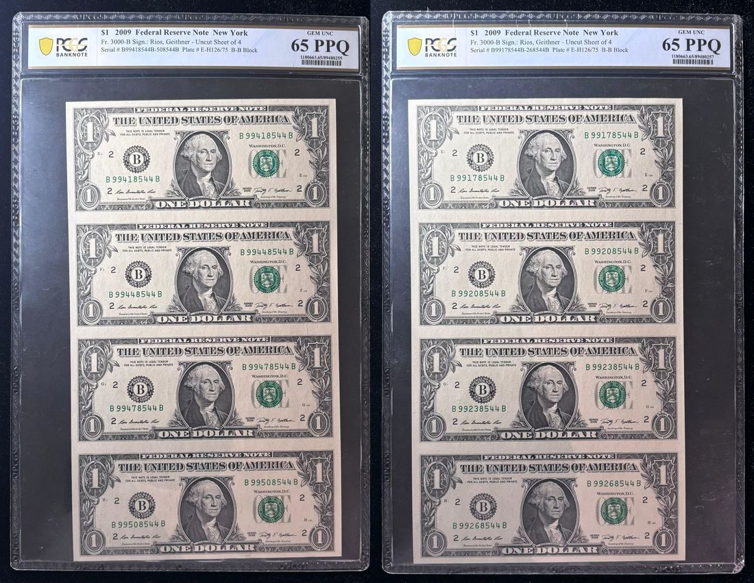 United States, Federal Reserve Note, New York, a pair of uncut sheet of 4X, $1, 2009, serial numbers B99178544B-268544B and B99418544B-508544B, (Fr.# 3000-B),