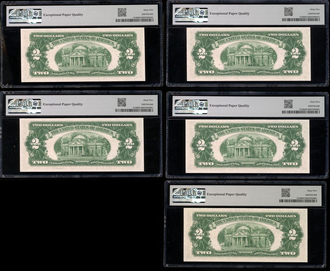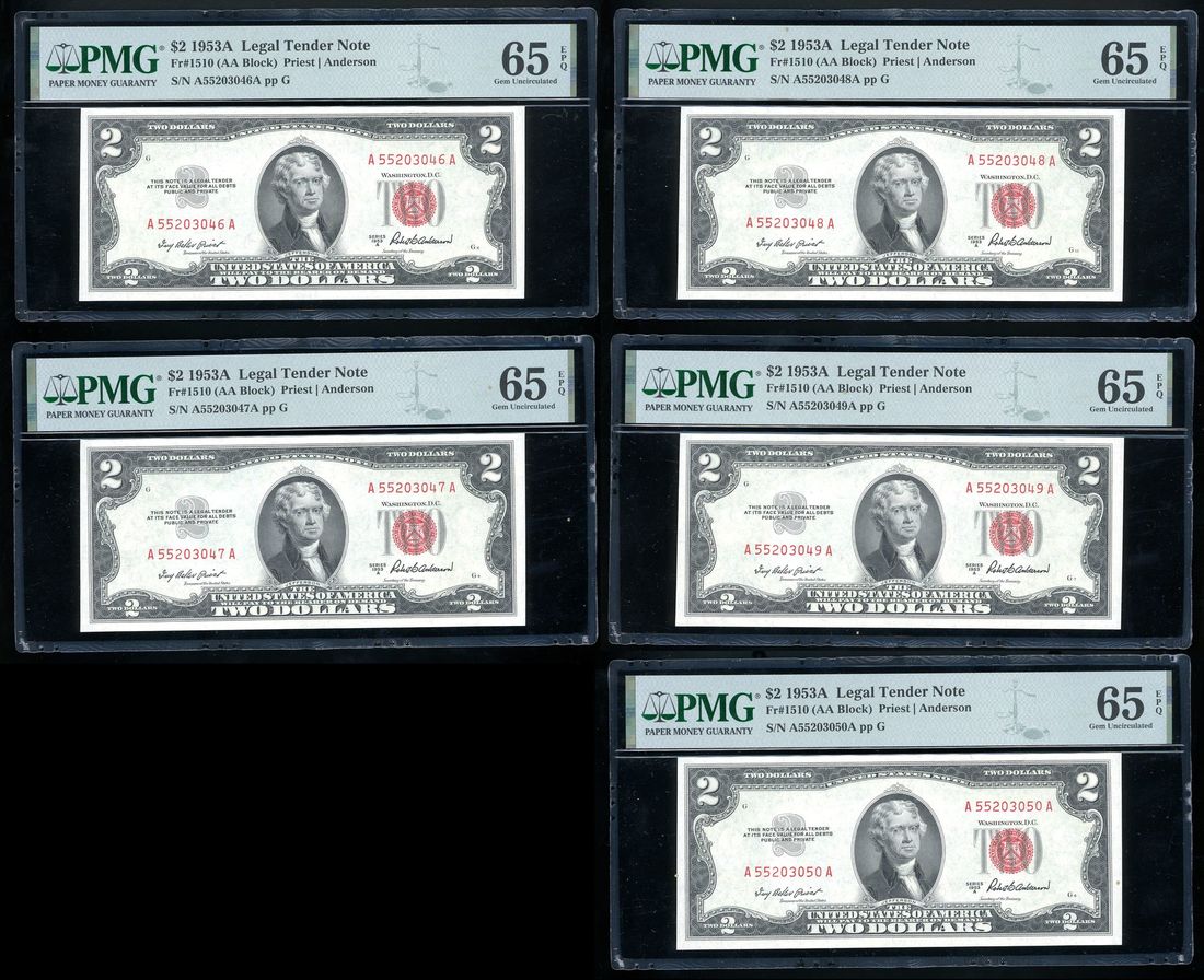 United States of America, Legal Tender Note, $2 (5), 1953A, serial number A55203046A/047A/048A/049A/050A, (Friedberg-1510), (AA Blcok), all PMG 65EPQ (5)