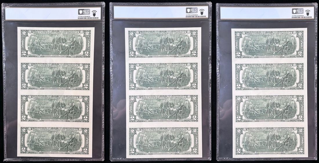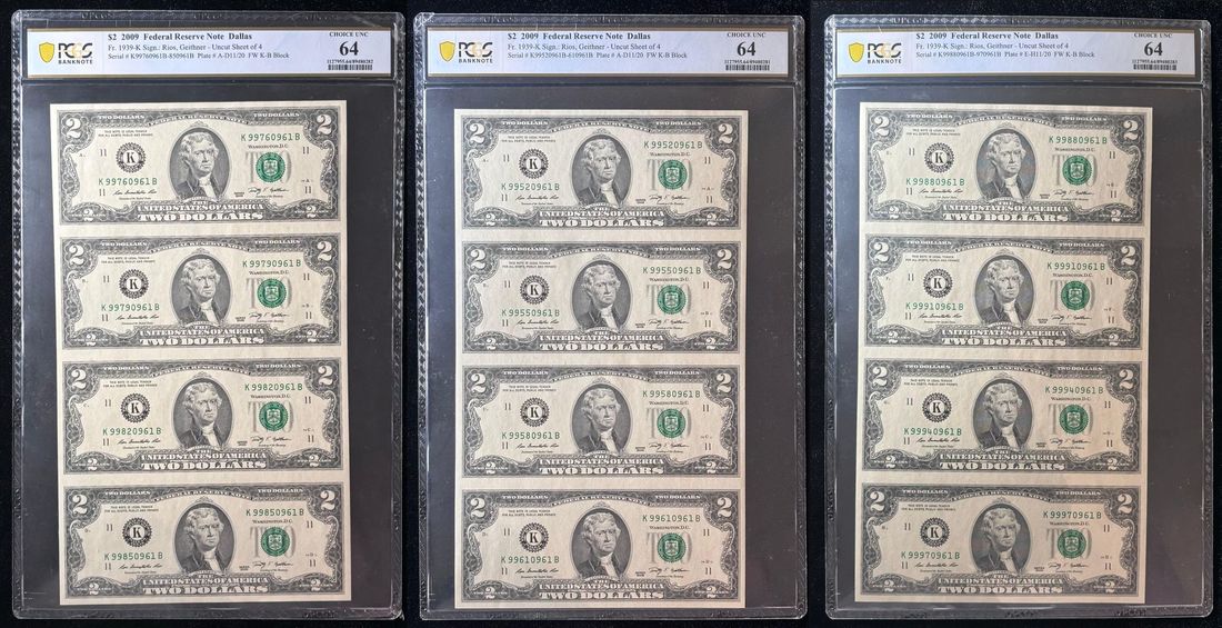 United States, Federal Reserve Note, Dallas, a group of 3X uncut sheet of 4X, $2, 2009, serial numbers K99520961B-610961B, K99760961B-850961B and K99880961B-970961B, (Fr.# 1939-K),
