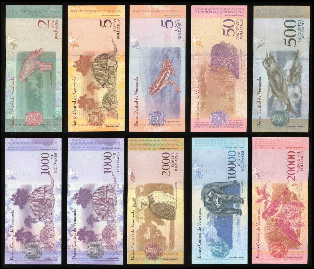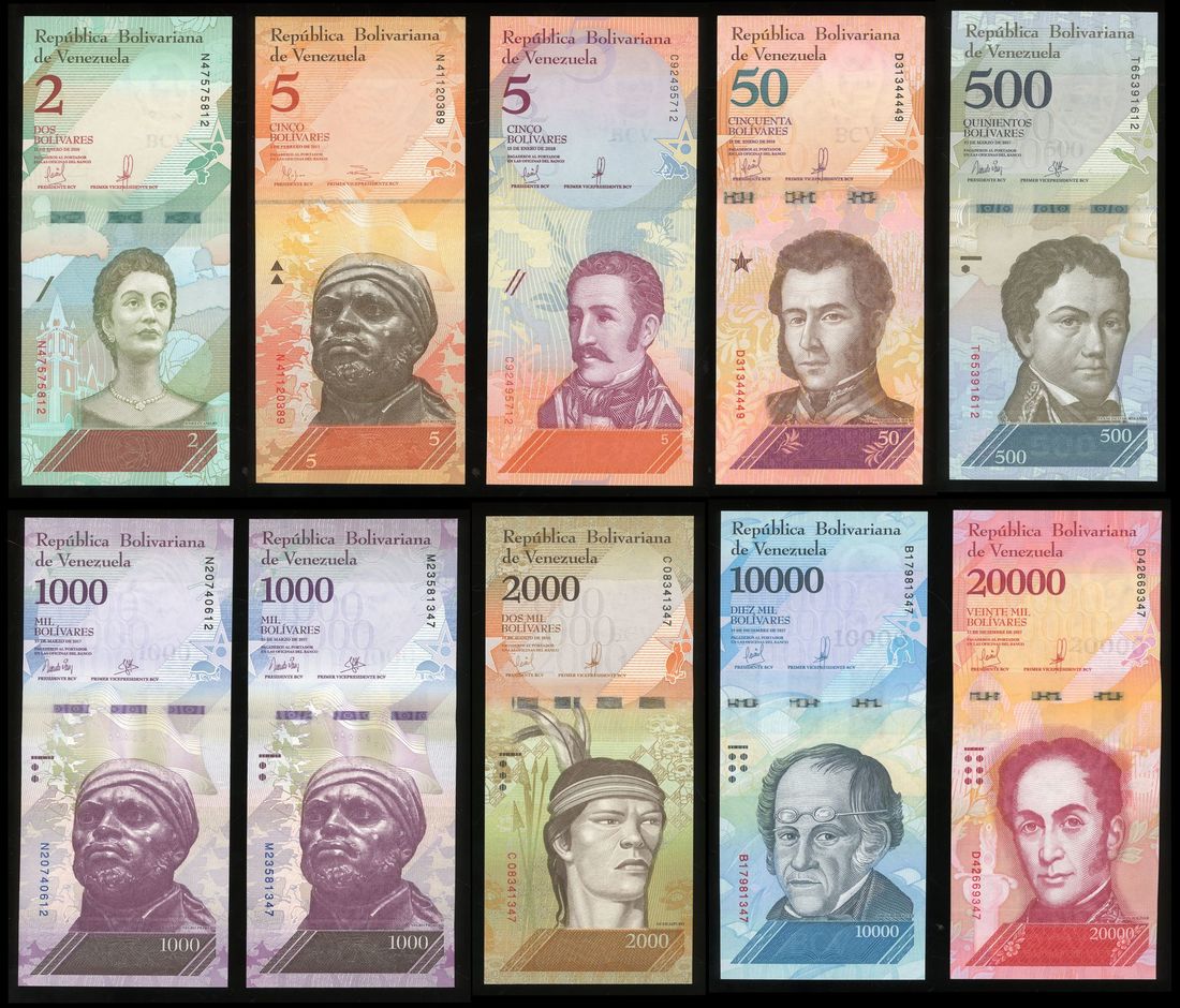 Banco Central de Venezuela, a group of 10x, including: 2011 5 bolilvares, 2017 500 bolivares, 2x 2017 1000 bolivares, 2016 2000 bolivares, 2017 10000 bolivares, 2017 20000 bolivares, 2018 2 bolivares, 2018 5 bolivares and 2018 50 bolivares,