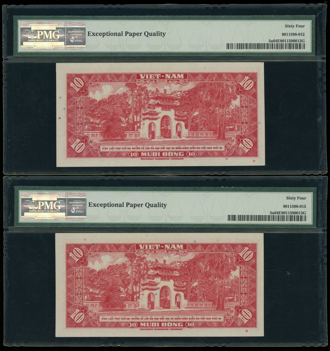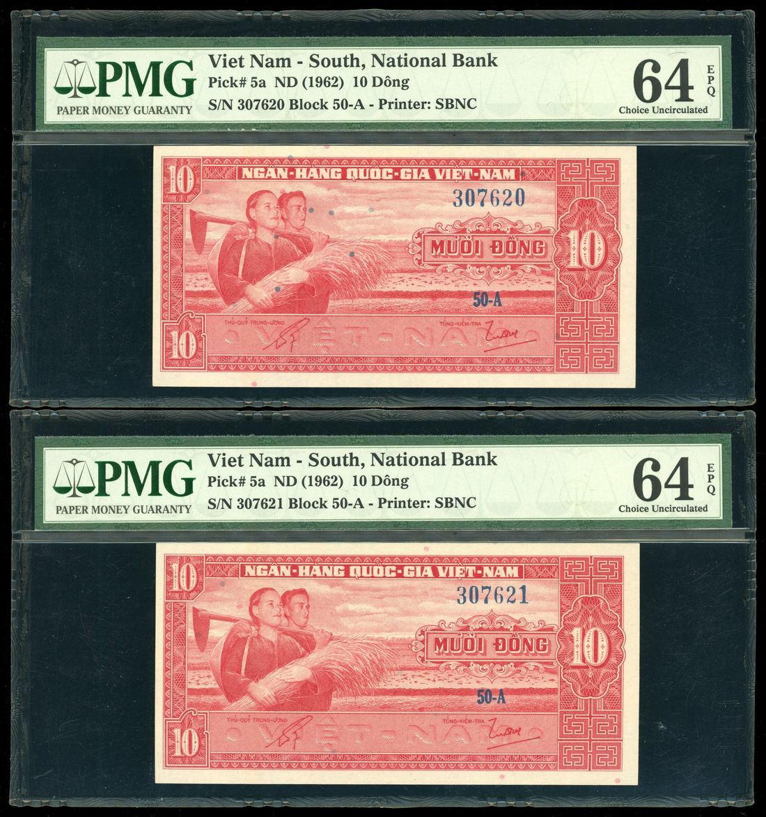 National Bank of Vietnam, consecutive 10 dong, ND (1962), serial number 50-A 307620/21, (Pick 5a), both PMG 64EPQ (2)