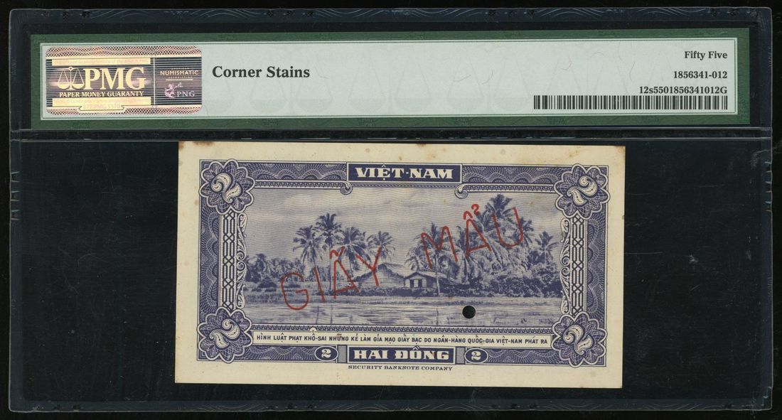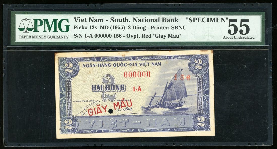 National Bank of Vietnam, specimen 2 dong, ND (1955), serial number 1-A 000000 156, (Pick 12s), PMG 55, corner stains
