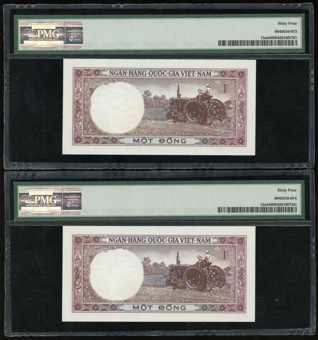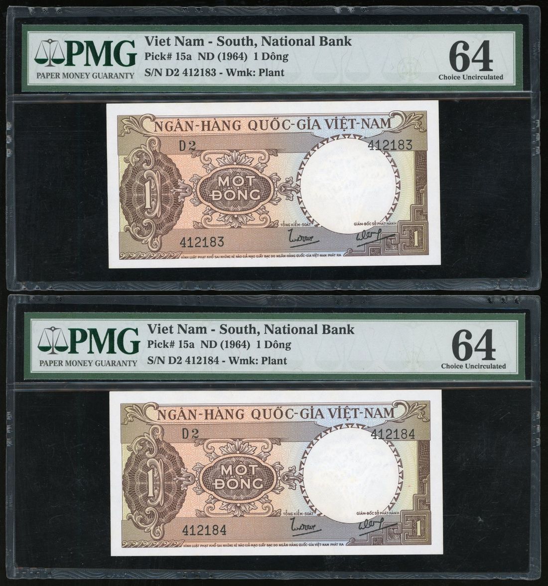 National Bank of Vietnam, consecutive pair 1 dong, ND (1964), serial numbers D2 412183/4, (Pick 15a), both PMG 64 (2)