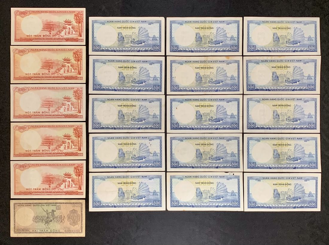 Ngân-Hàng Quoc-Gia Viet-Nam, South Vietnam, a group of 21, including: 5x 100 dong, 1x 200 dong and 15x 500 dong, ND (1966),