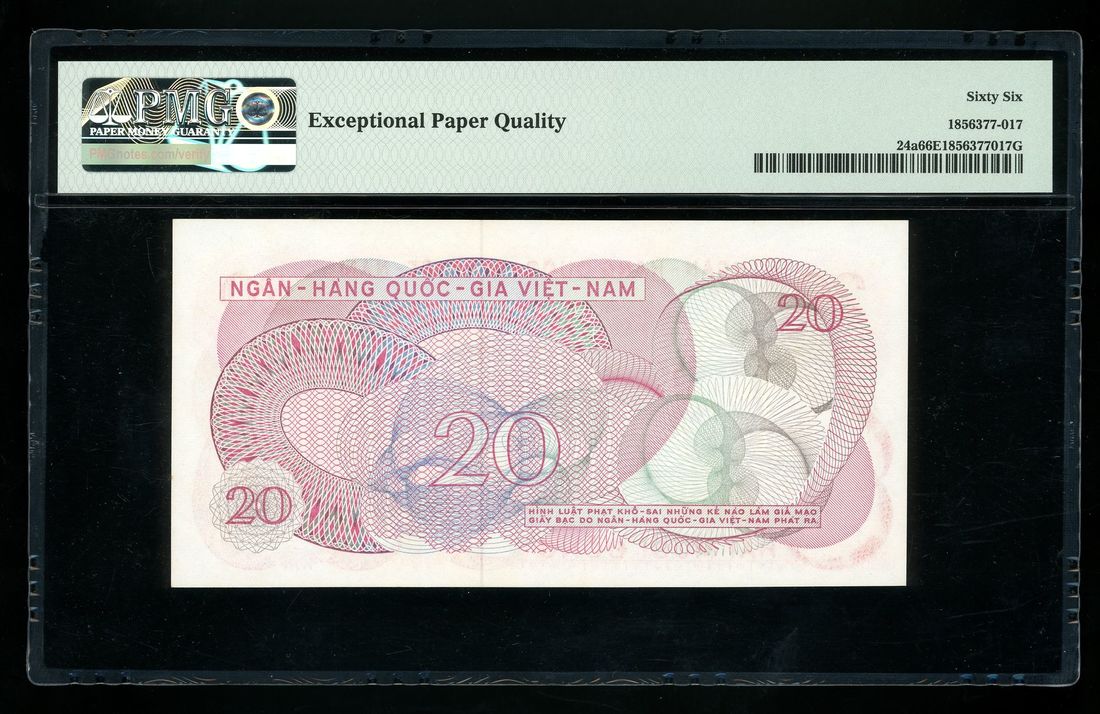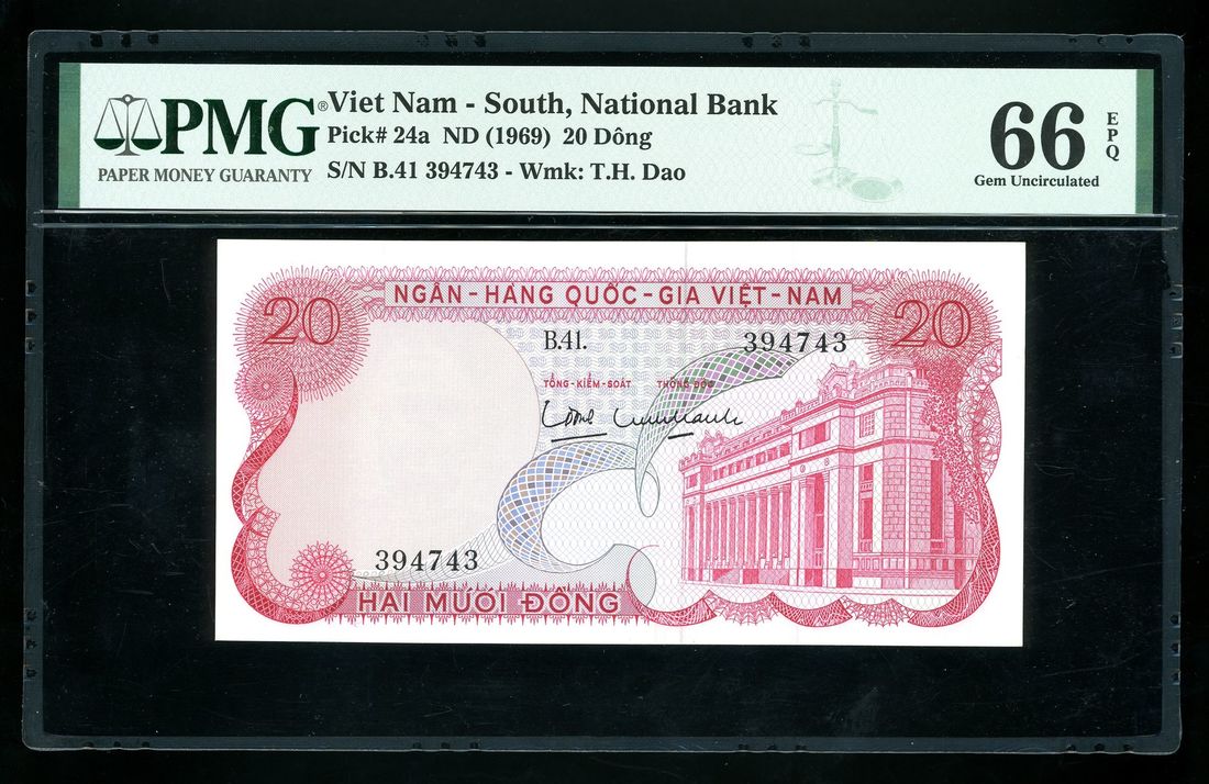 National Bank of Vietnam, 20 dong, ND (1969), serial number B.41 394743, (Pick 24a), PMG 66EPQ. PMG census 2nd highest grade, top grade is 67EPQ