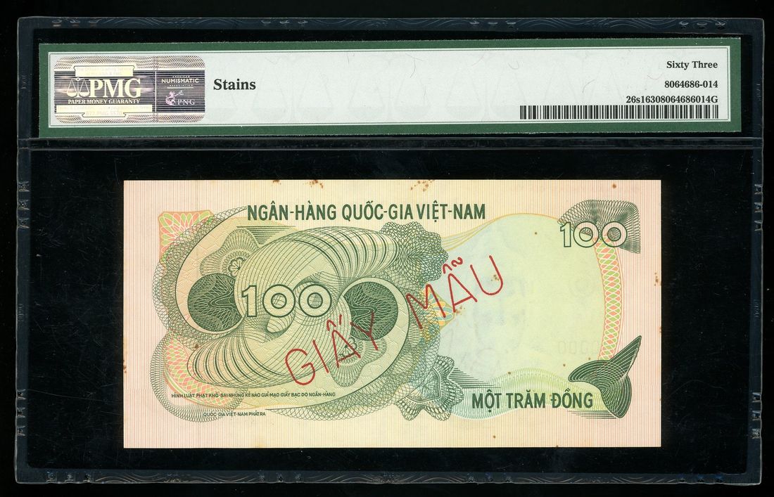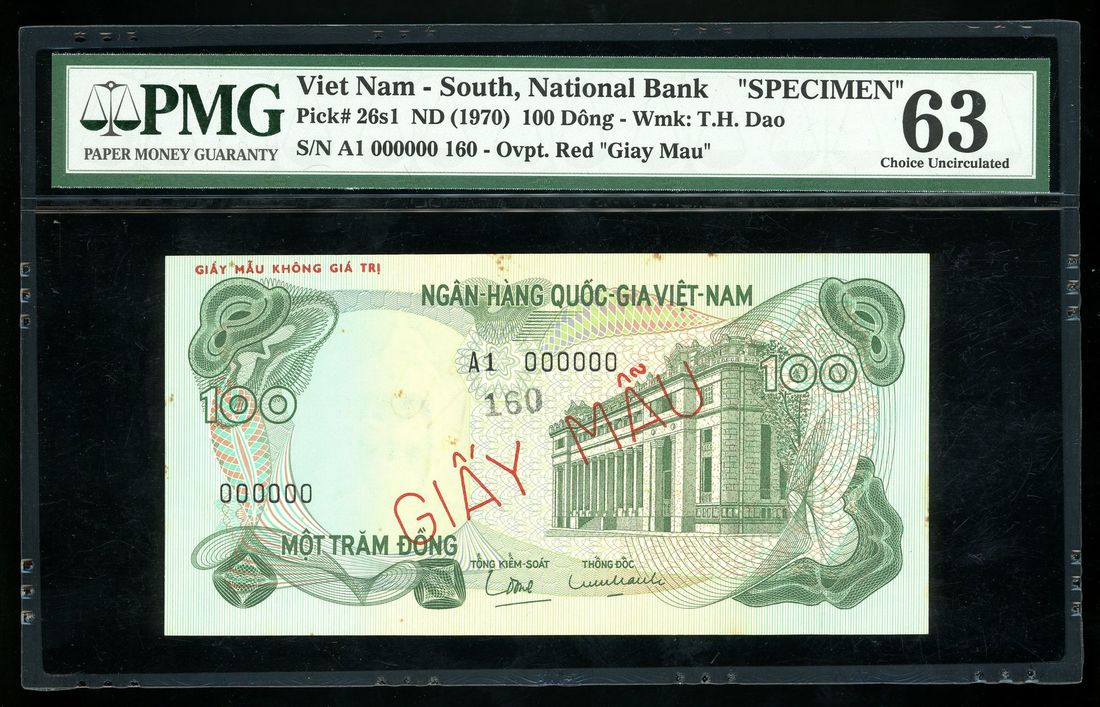 National Bank of Vietnam, specimen 100 dong, ND (1970), serial number A1 000000 160, (Pick 26s1), PMG 63, stains.
