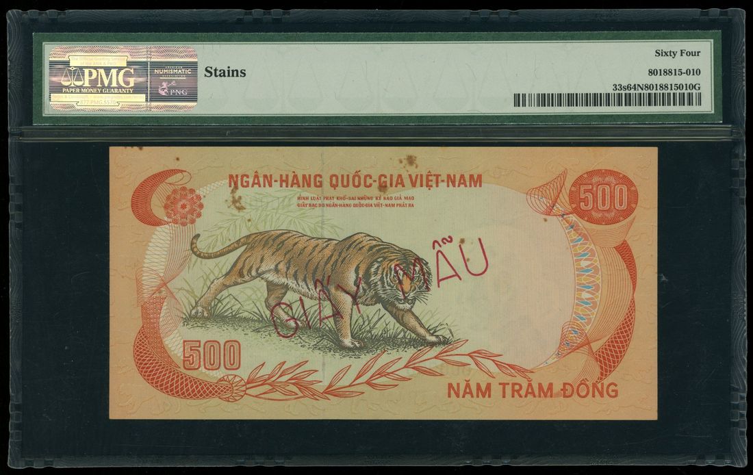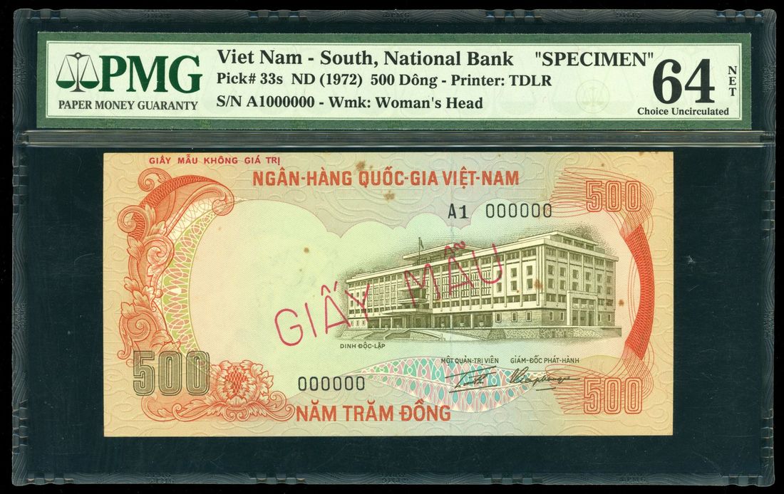 National Bank of Vietnam, specimen 500 dong, ND (1972), serial number A1 000000, (Pick 33s), PMG 64NET, stains