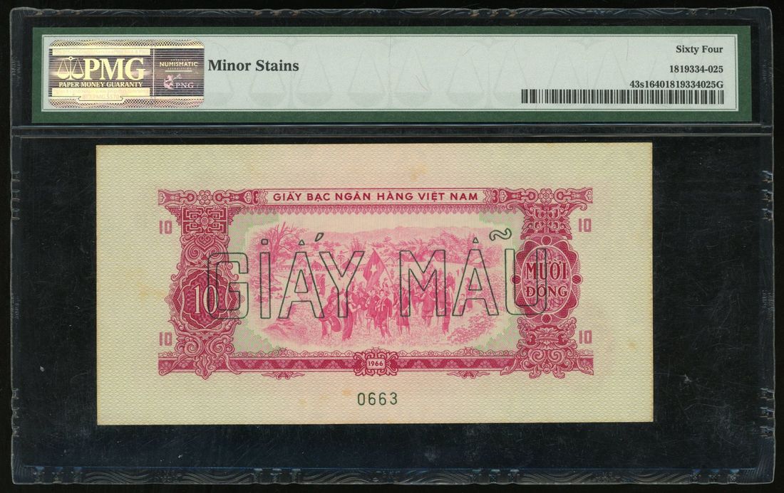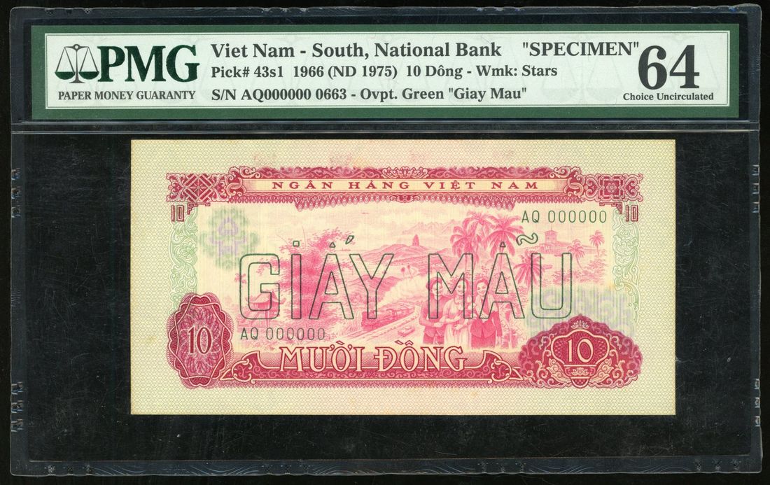 National Bank of Vietnam, specimen 10 dong, 1966 ND (1975), serial number AQ 000000 0663, (Pick 43s1), PMG 64, minor stains