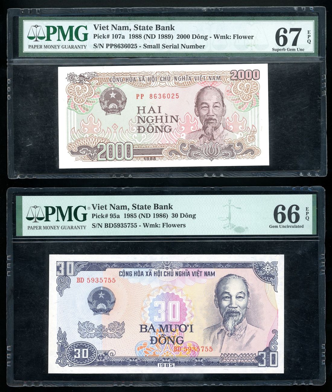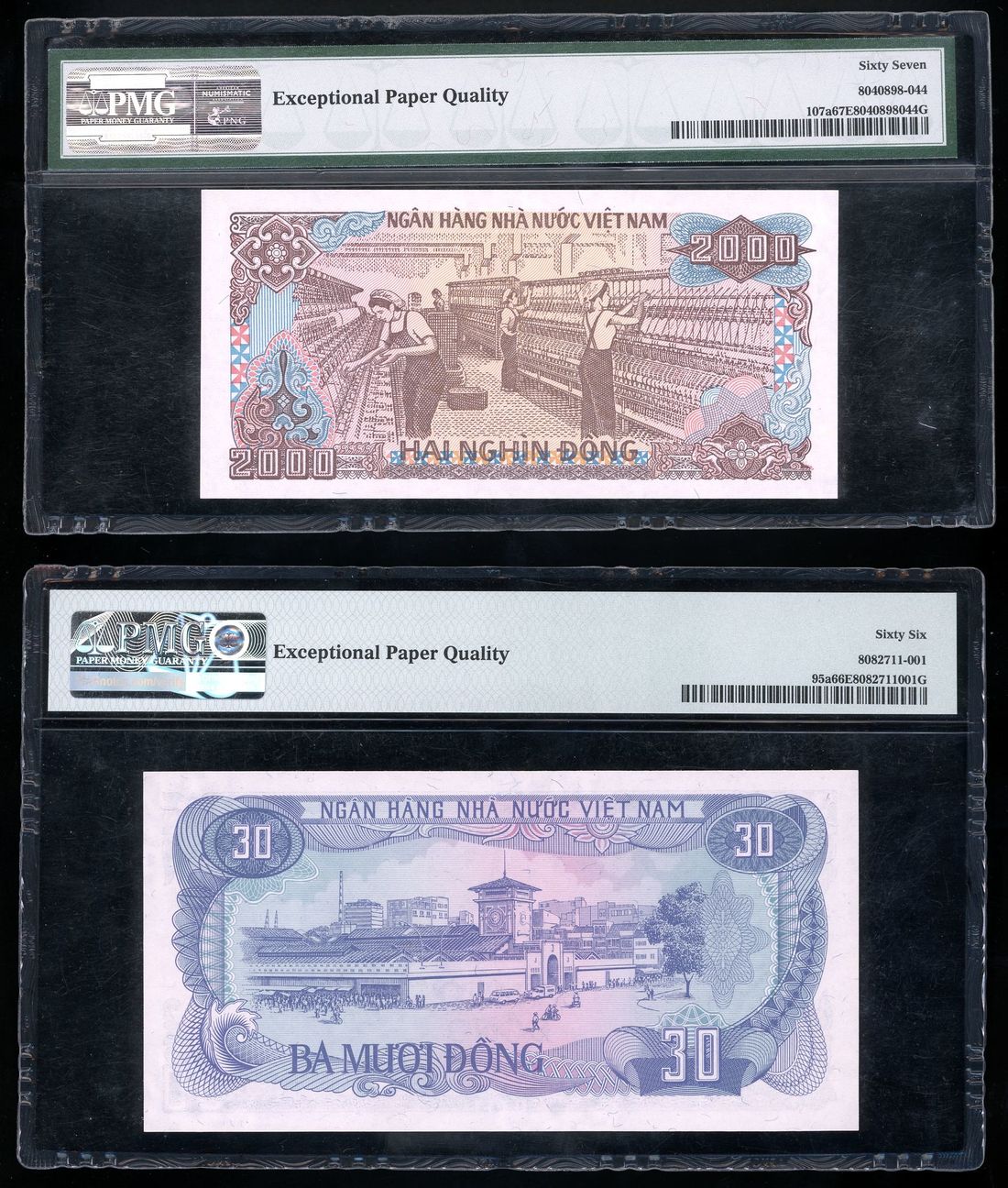 State Bank of Vietnam, a pair, including 30 dong 1986 and 2000 dong 1989, (Pick 95a, 107a), PMG 66EPQ and 67EPQ respectively (2)