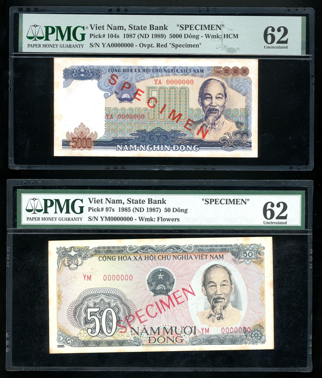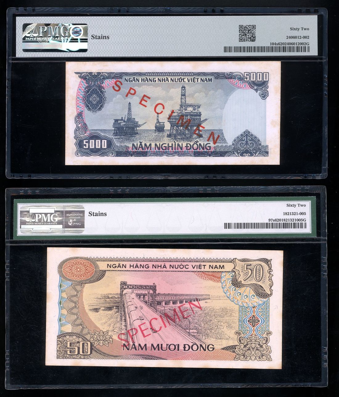 State Bank of Vietnam, a pair of specimen, including 50 dong 1987 and 5000 dong 1989, (Pick 97s, 104s), both PMG 62 (stains)