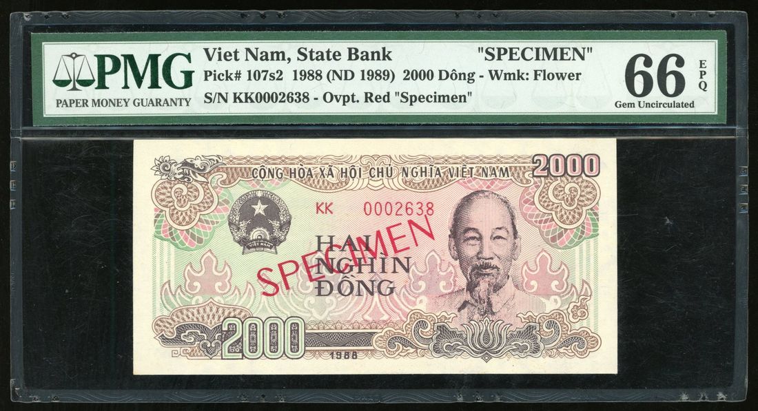 State Bank of Vietnam, specimen 2000 dong, 1988 ND (1989), serial number KK 0002638, (Pick 107s2), PMG 66EPQ