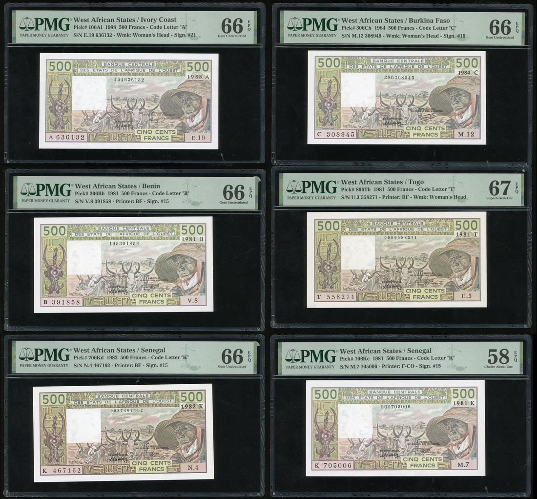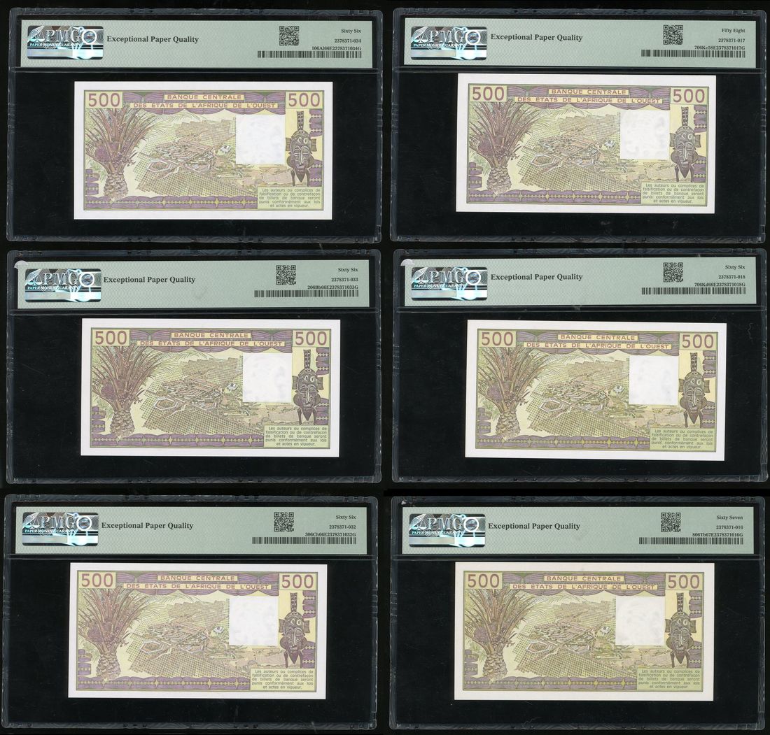 West African States, 500 francs (6), including, -Ivory Coast, 1988, PMG 66EPQ, (SINGLE TOP POP),