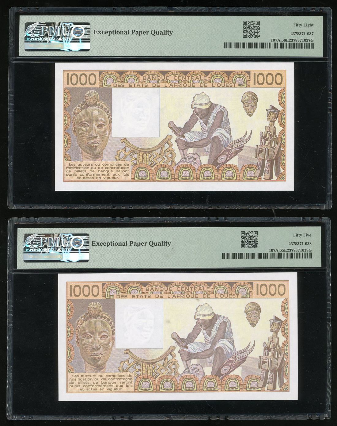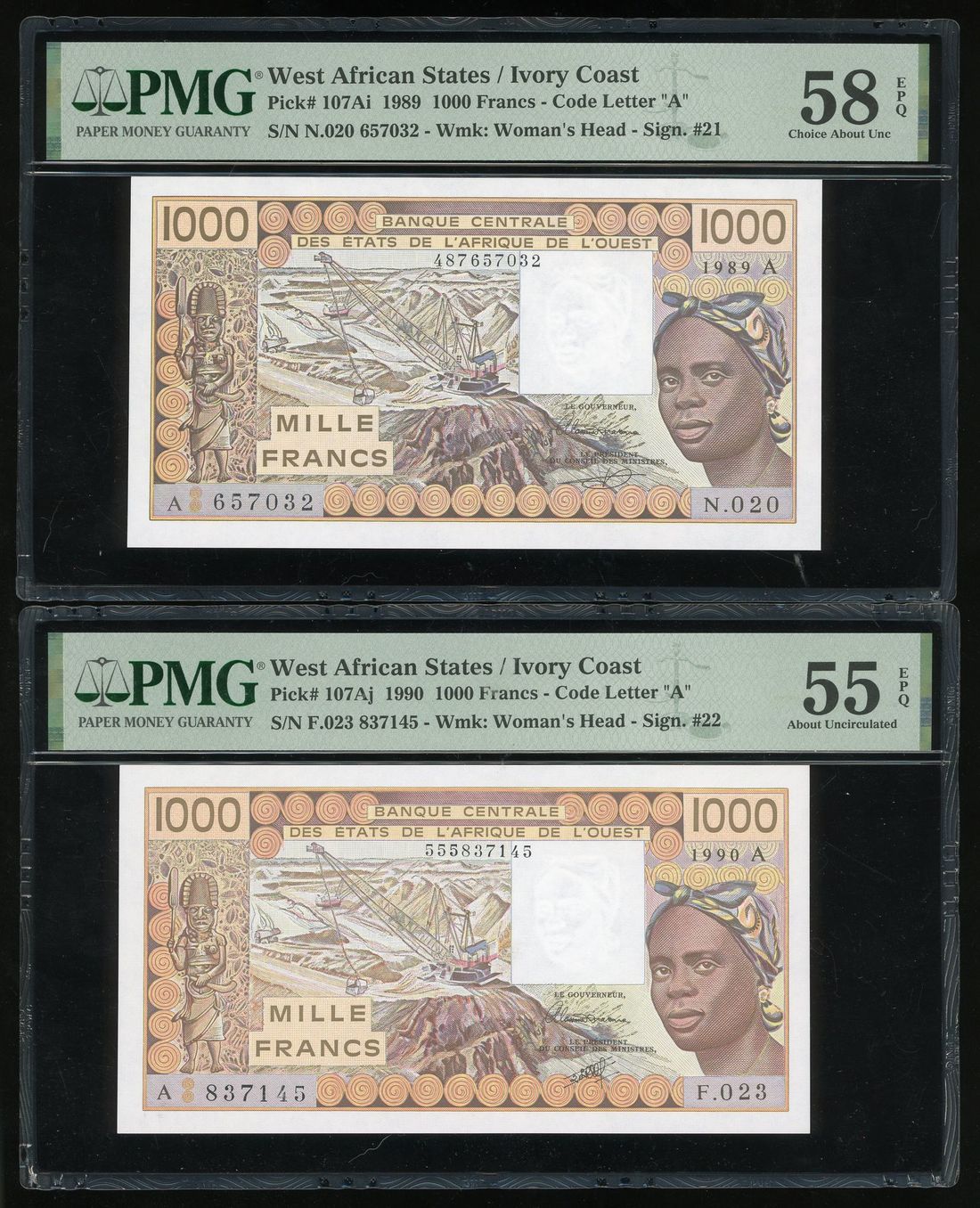 West African States, Ivory Coast, 1000 francs (2), 1989, 1990, (Pick 107Ai, j), PMG 58EPQ and 55EPQ (2)