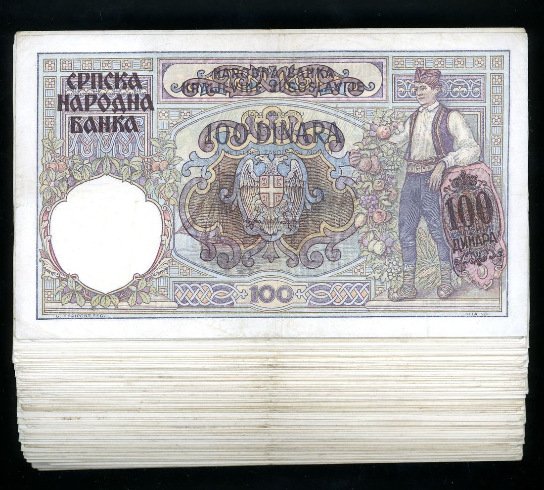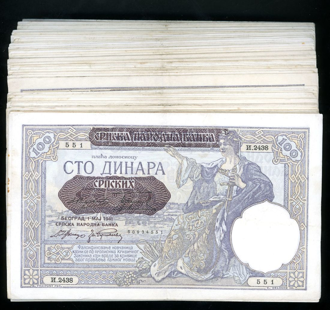 Yugoslavia, a group of 98x 100 dinaras, 1941, the Serbian 100 Srpskih Dinara is on overprint on the Yugoslavian 100 dinara, (Pick 23), mixed condition, VF-XF,viewing recommended, sold as is (98)