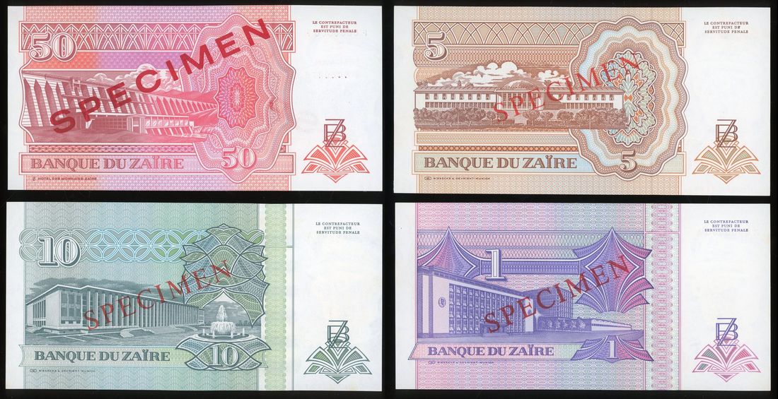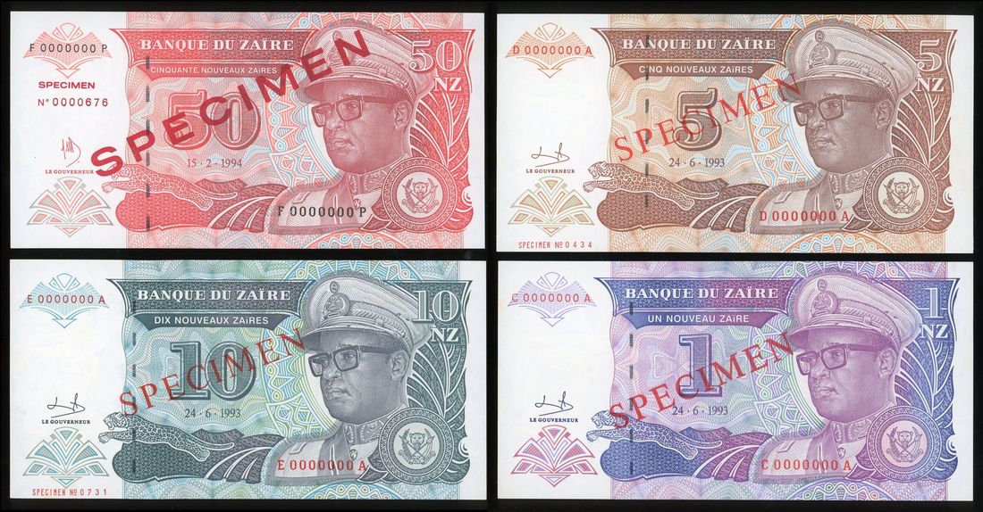 Banque du Zaire, a group of specimen, 1993-94, including 1, 5, 20 and 50 nouveau zaire, (Pick 52s, 53s, 54s, 57s), uncirculated (4)