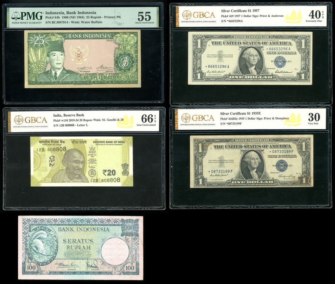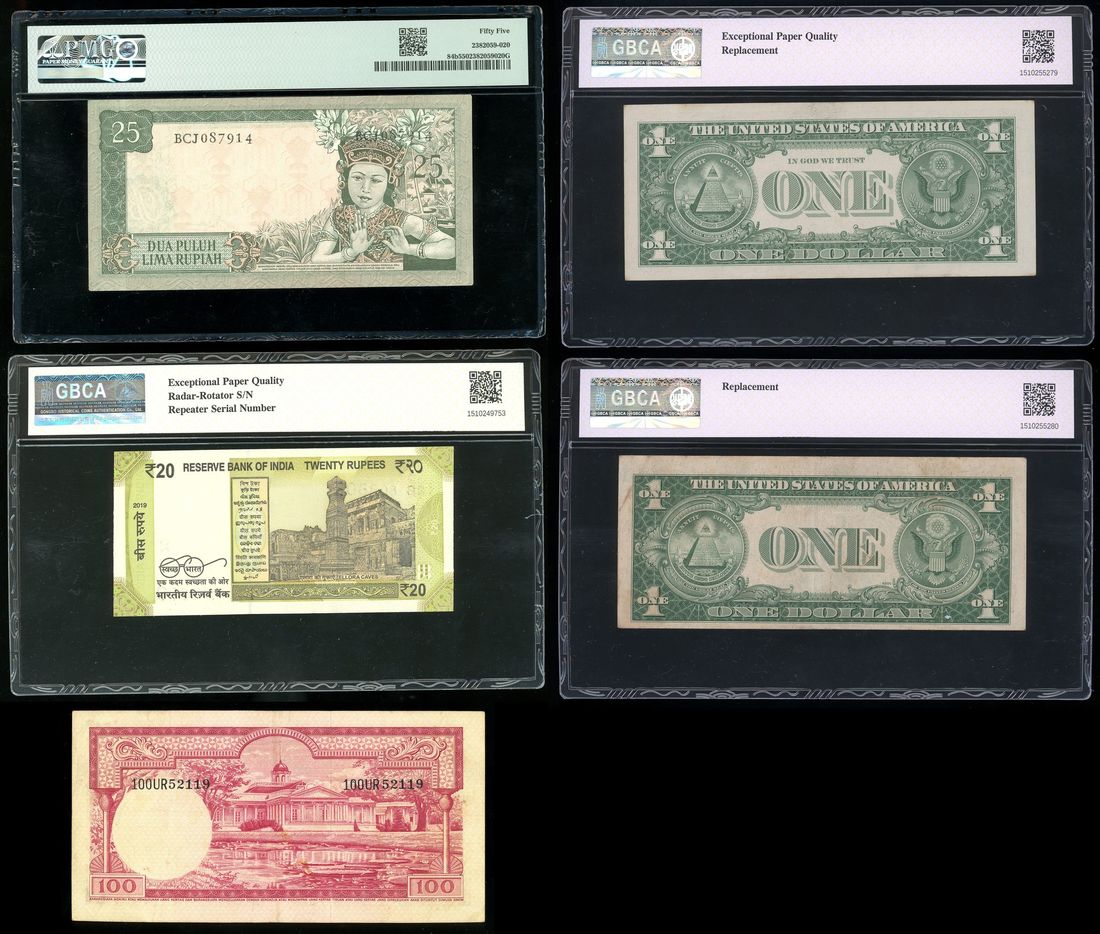 World Banknotes, a group of 5x, including, -India, 20 rupees, 2019, serial number 12B 808808, GBCA 66EPQ