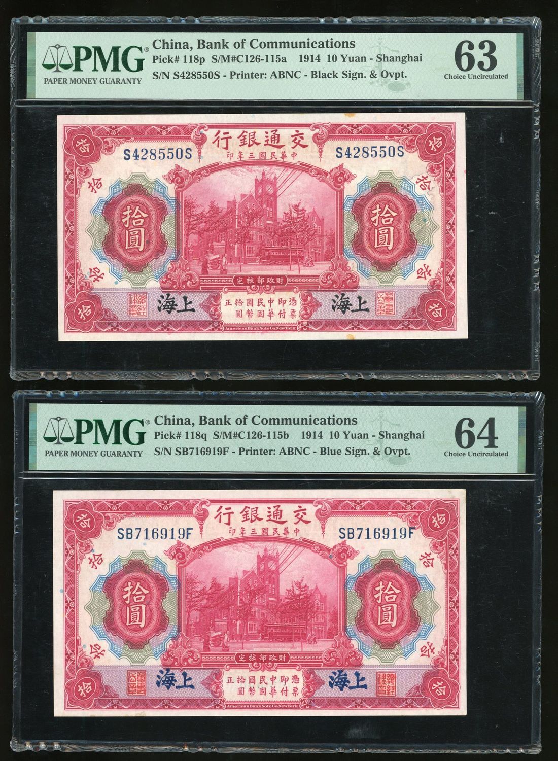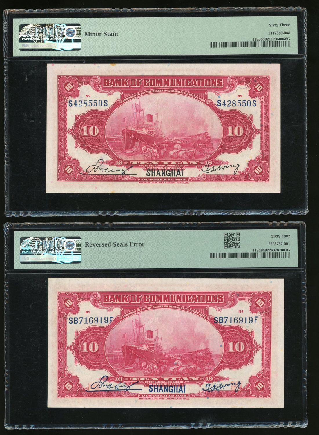 Bank of Communications, China, ERROR 10 yuan, Year 3 (1914), serial number SB716919F, chief manager and director red seal swapped at obverse, also includes a note with normal seal for comparison,