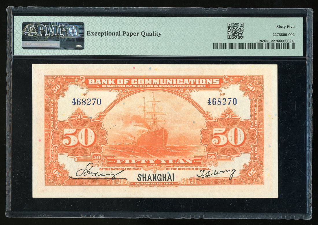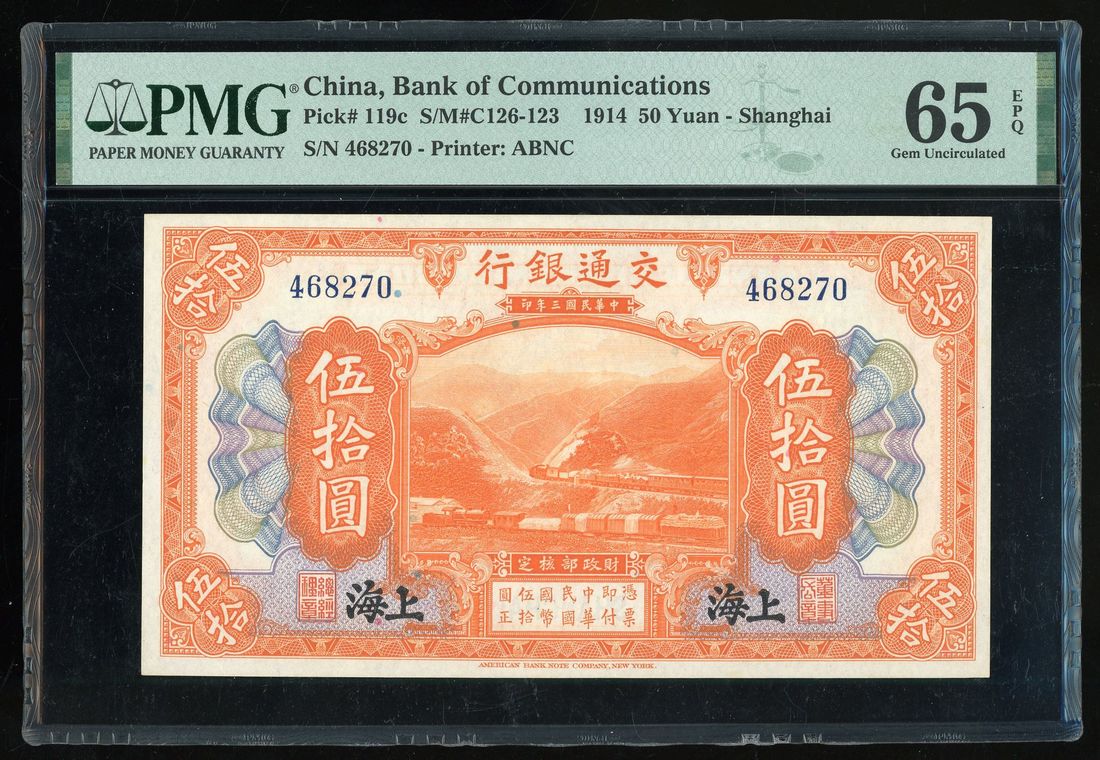 Bank of Communications, China, 50 yuan, Year 3 (1914), Shanghai, serial number 468270, (Pick 119c), PMG 65EPQ. PMG census 3rd highest grade with only 11 better. Key type