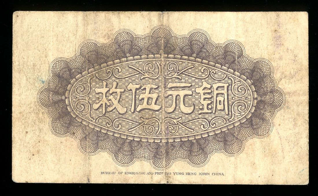 Yung Heng Provincial Bank of Kirin, China, 5 copper coins, Year 10 (1921), Harbin, serial number 0021911, (Pick S1031), about very fine. Rare in issued form, usually specimens are seen