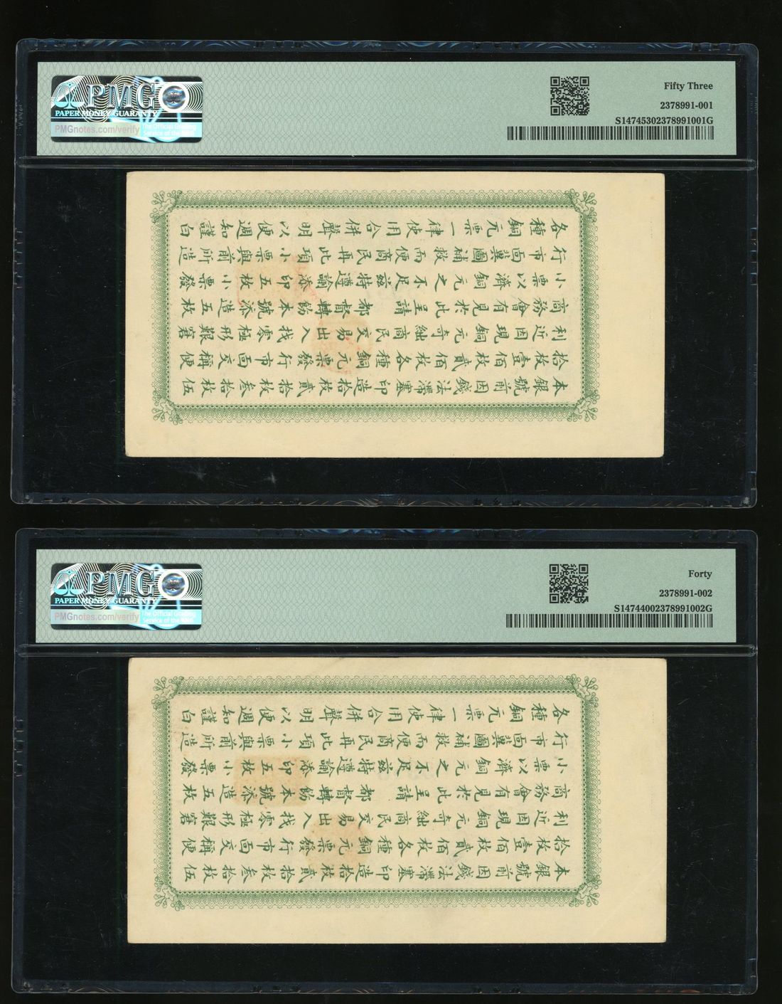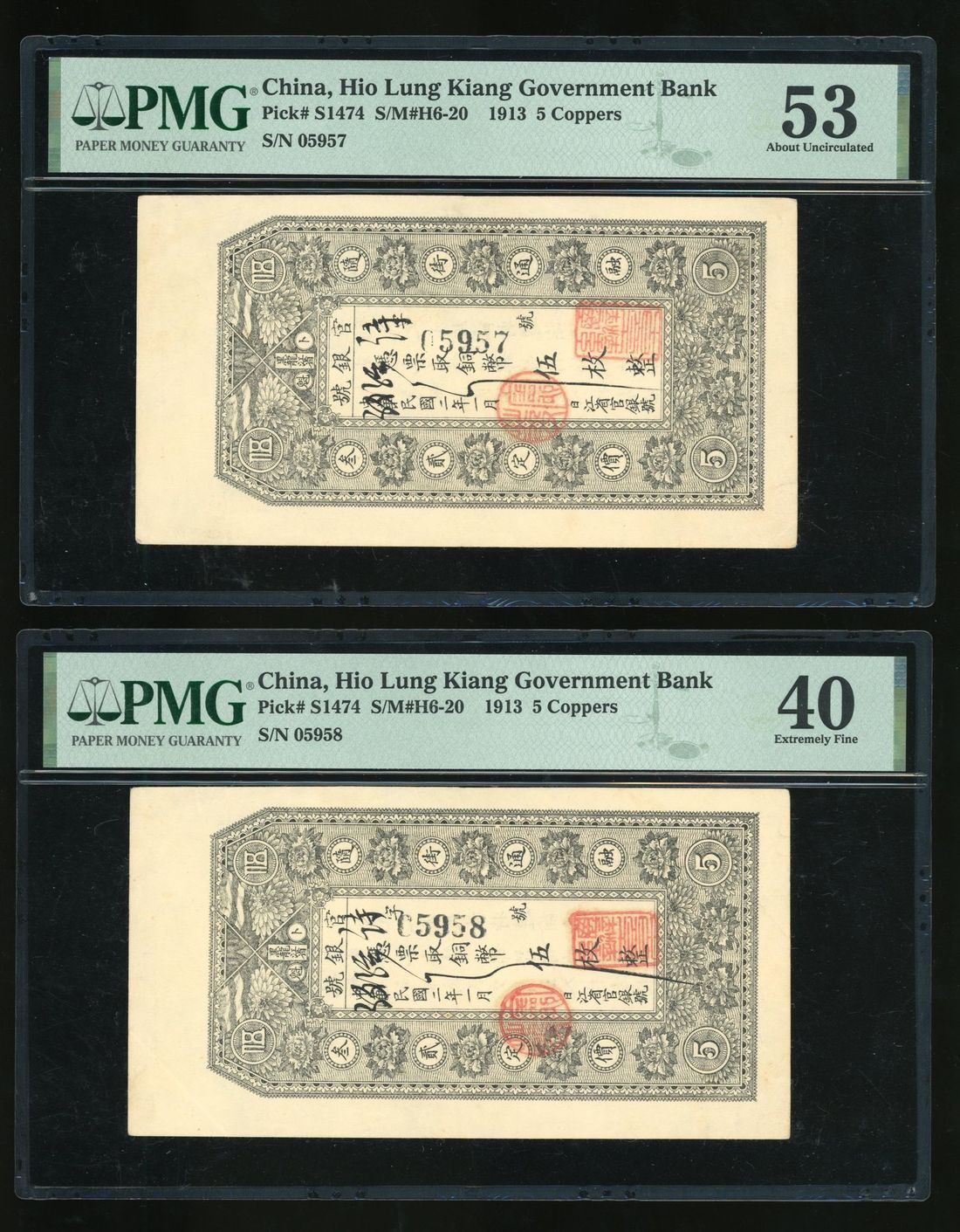 Hoi Lung Kiang Government Bank, China, consecutive pair 5 coppers, Year 2 (1913), serial numbers 05957/58, (Pick S1474), PMG 40 and 53 respectively. 3rd highest grade and TOP POP examples (2)