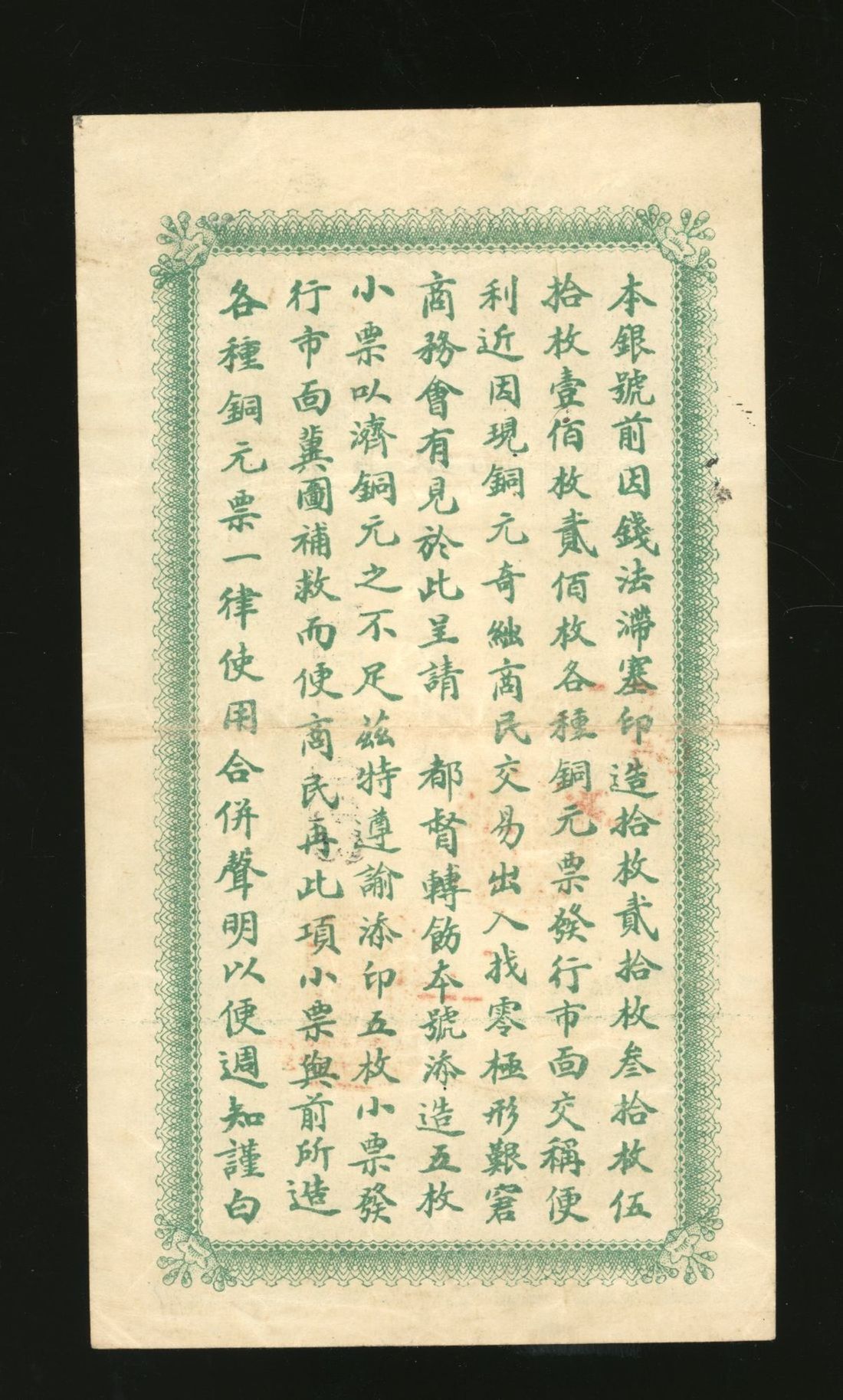 Hoi Lung Kiang Government Bank, China, ERROR 5 coppers, Year 2 (1913), serial number 00062, "5" and "Wu" at left mirrored printing,