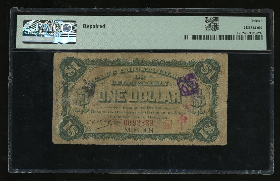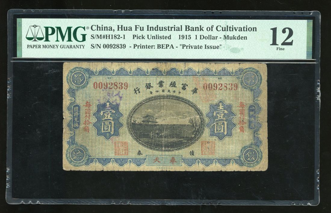 Hua Fu Industrial Bank of Cultivation, China, 1 yuan, Mukden, Year 3 (1915), serial number 0092839, blue on green, fort scene at centre,