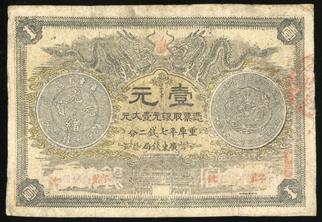 Kwangtung Province Currency Bureau, China, 1 yuan, 30th Year of Guangxu (1904), serial number uncertain, (Pick S2385), discolouration, repaired, fine.