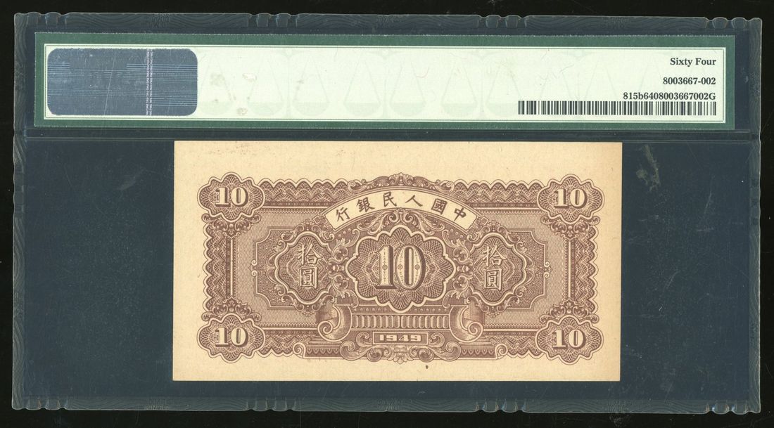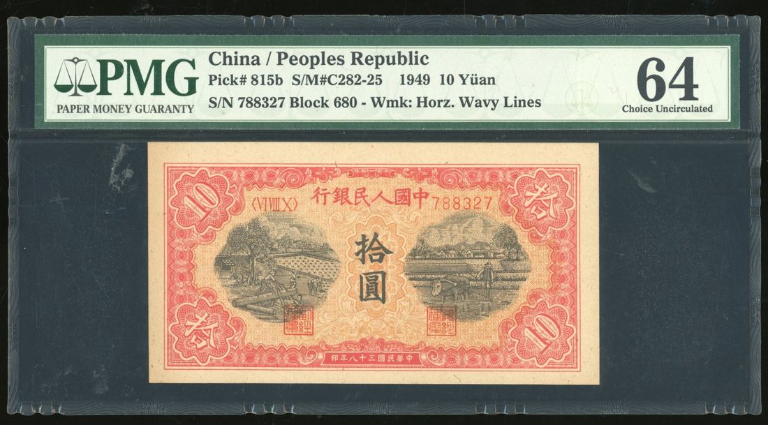 People's Bank of China, 1st Series Renminbi, 1949, 10 yuan, serial number VI VIII X 788327, "Ploughing and Wood Sawing", horizontal wavy lines watermark,