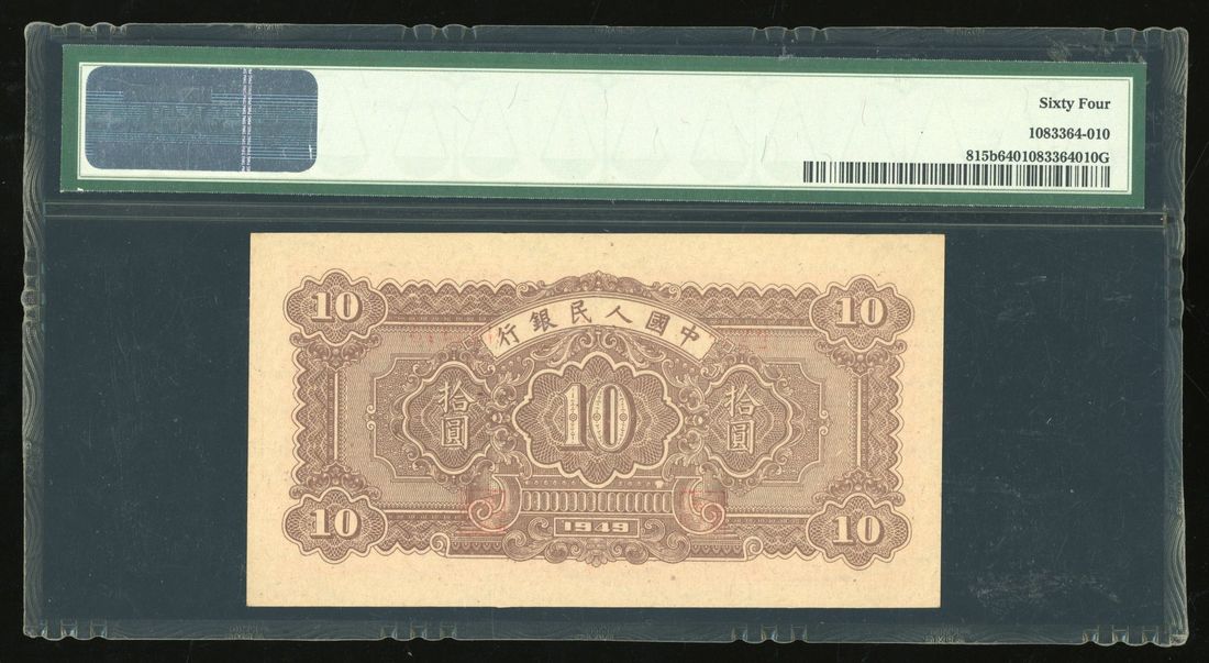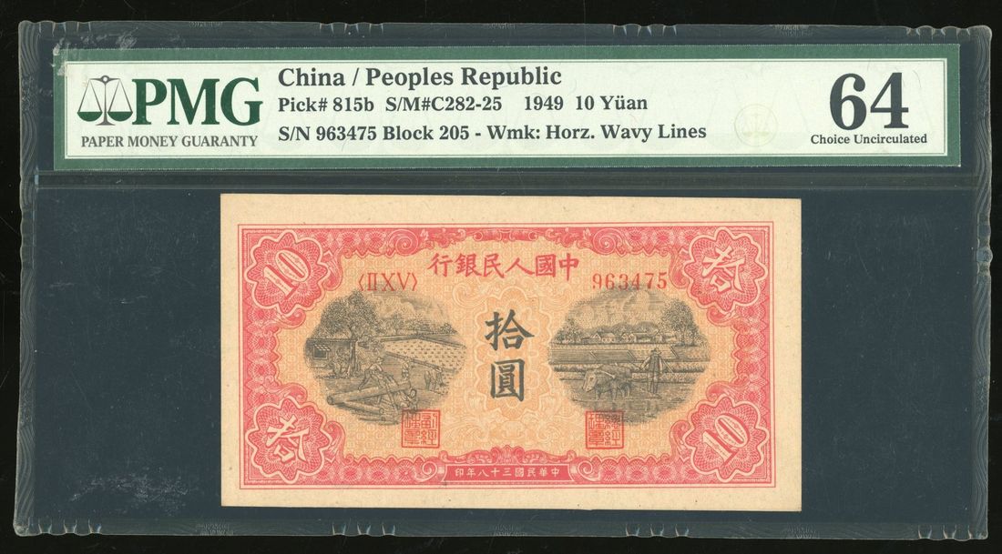 People's Bank of China, 1st Series Renminbi, 1949, 10 yuan, serial number II X V 963475, "Ploughing and Wood Sawing", horizontal wavy lines watermark,