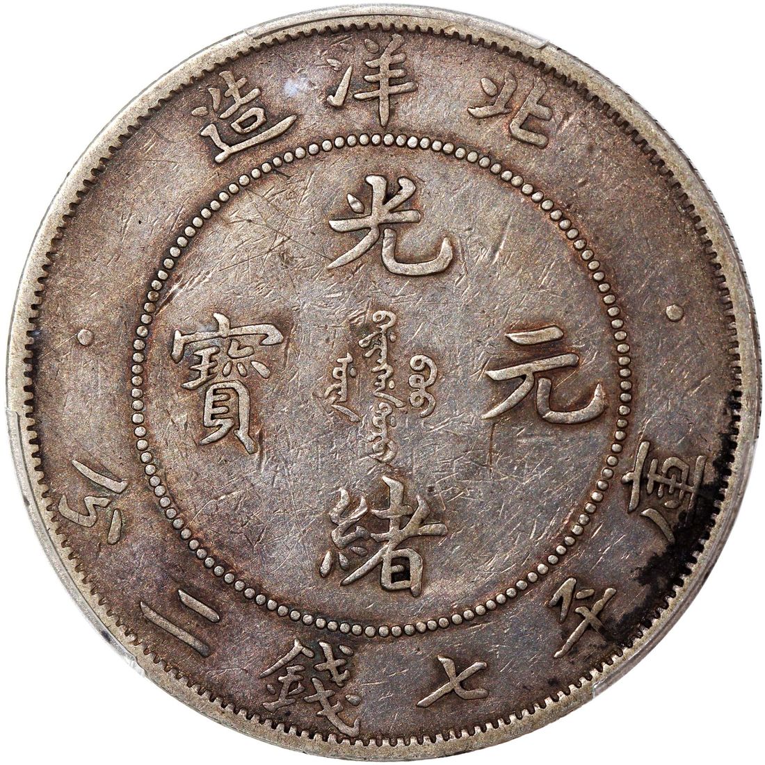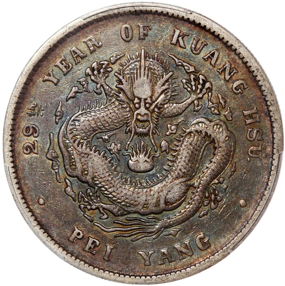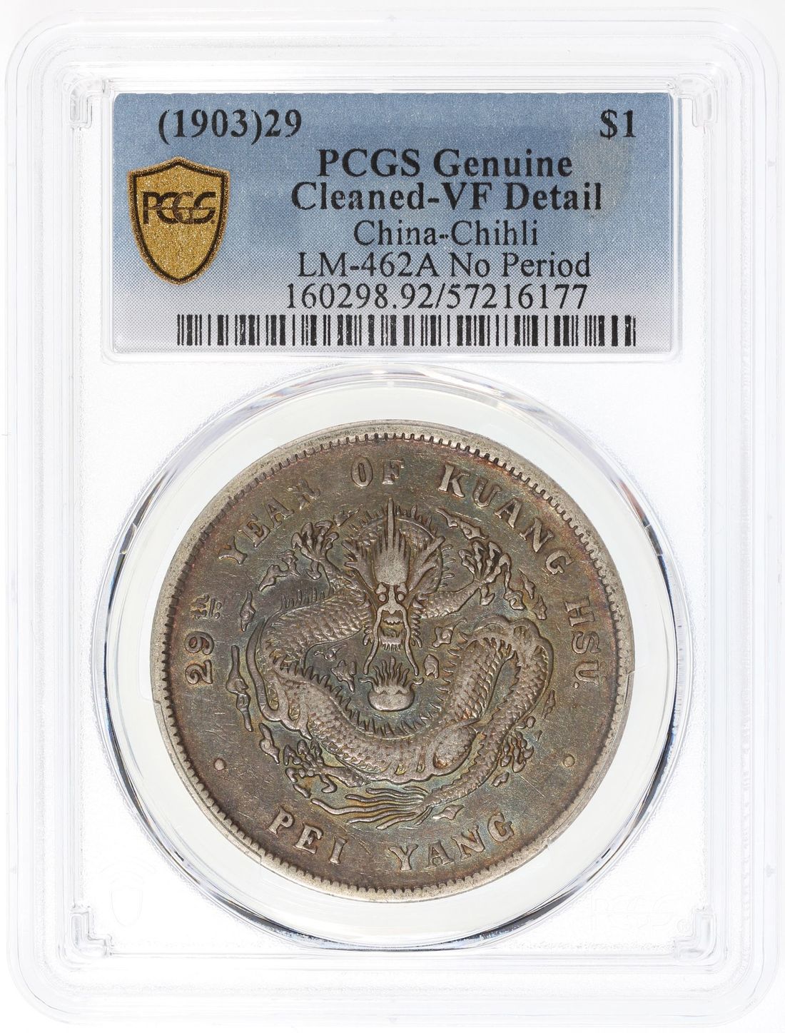 China, Qing Dynasty, Chihli Province, [PCGS VF Detail] silver dollar, 29th Year of Guang Xu (1903), without period after 'YANG' variety, (LM-462A, K-205B), Cleaned, Cert. #57216178, the VF designation being a bit conservative in this cataloguers' opinion. Toned in deep blue and green, offering plenty of visual appeal