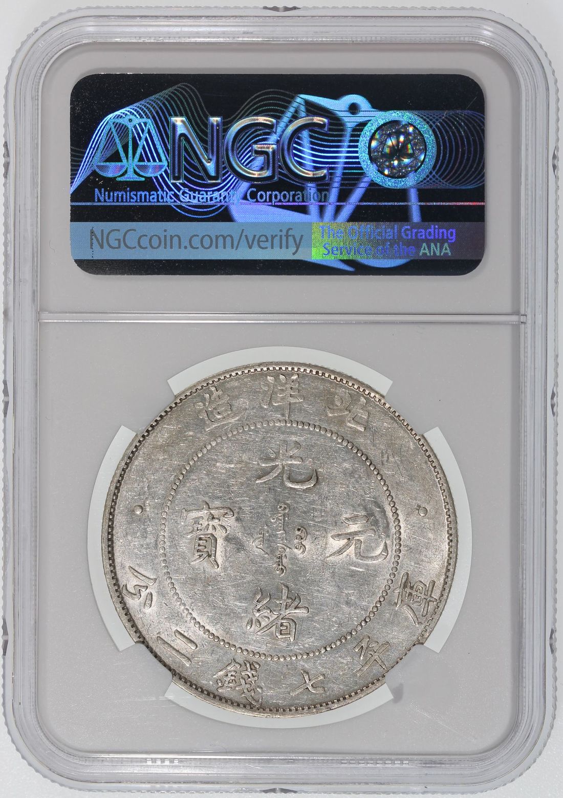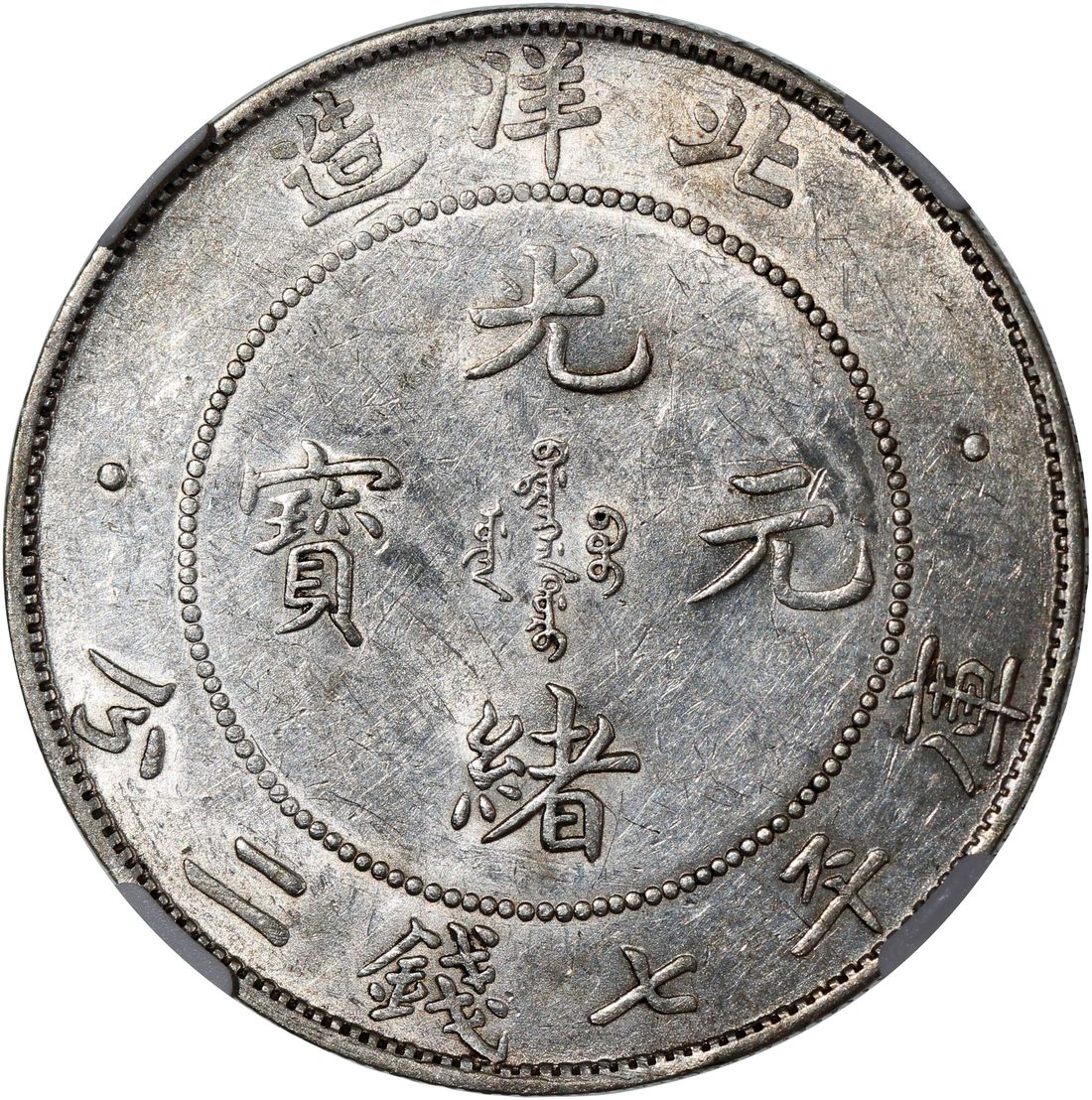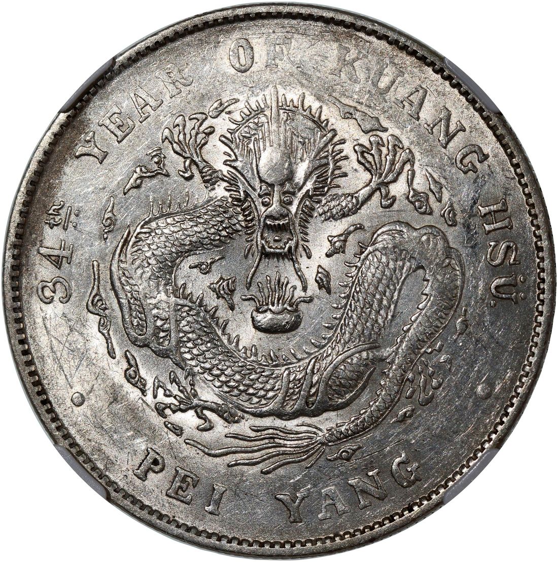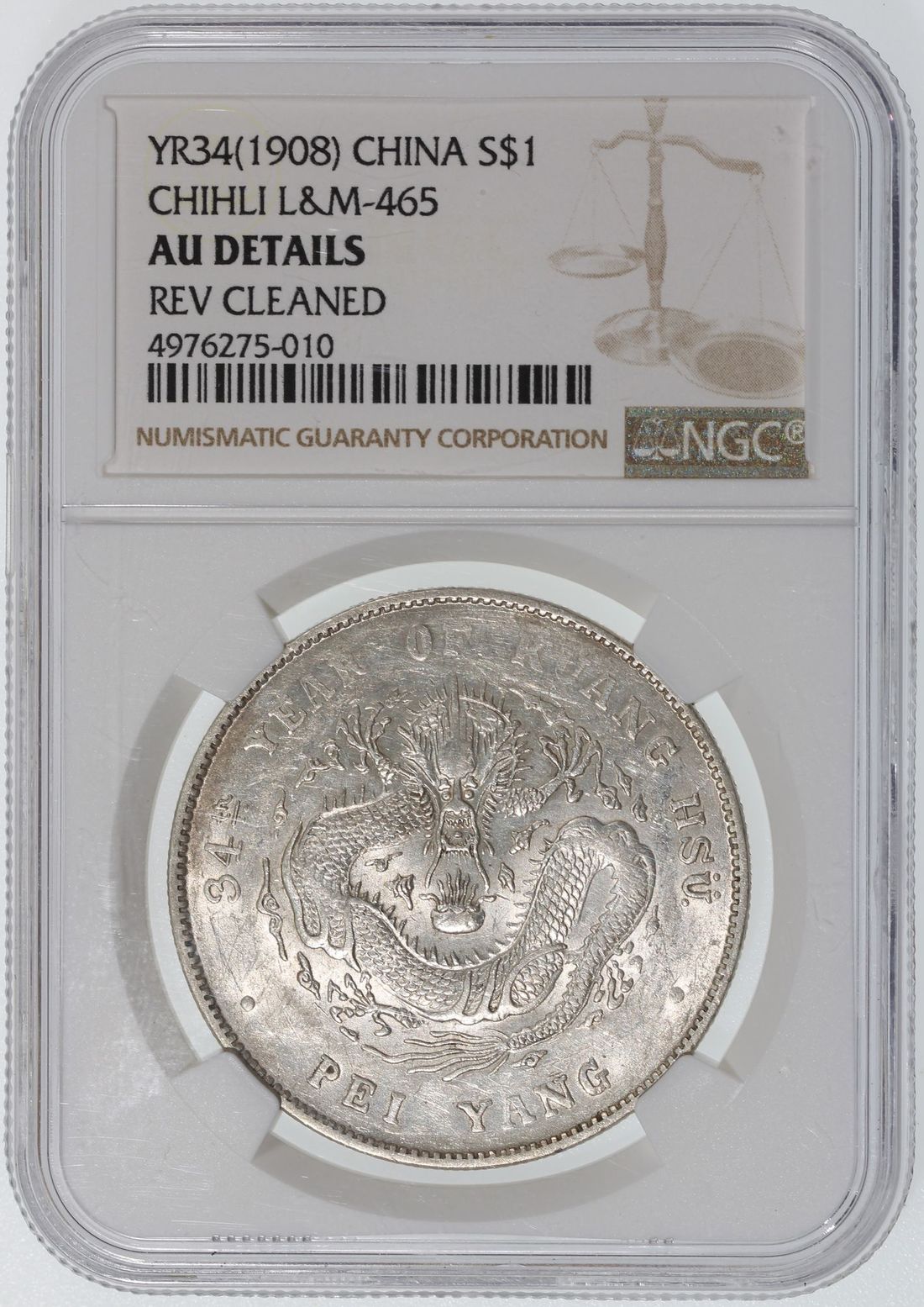 China, Qing Dynasty, Chihli Province, [NGC AU Details] silver dollar, 34th Year of Guang Xu (1908), (LM-465), reverse cleaned. Cert.# 4976275-010. With luster