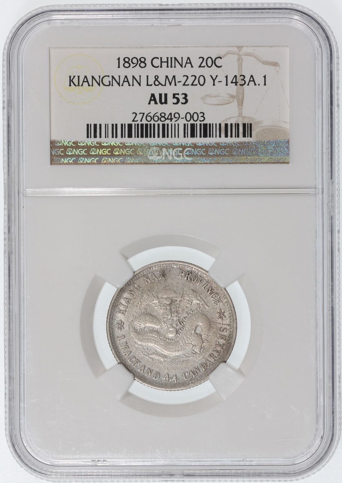 China, Qing Dynasty, Kiangnan Province, [NGC AU53] silver 20 cents, Guangxu Yuan Bao, Wuxu Year (1898), (LM-220), Cert.# 2766849-003