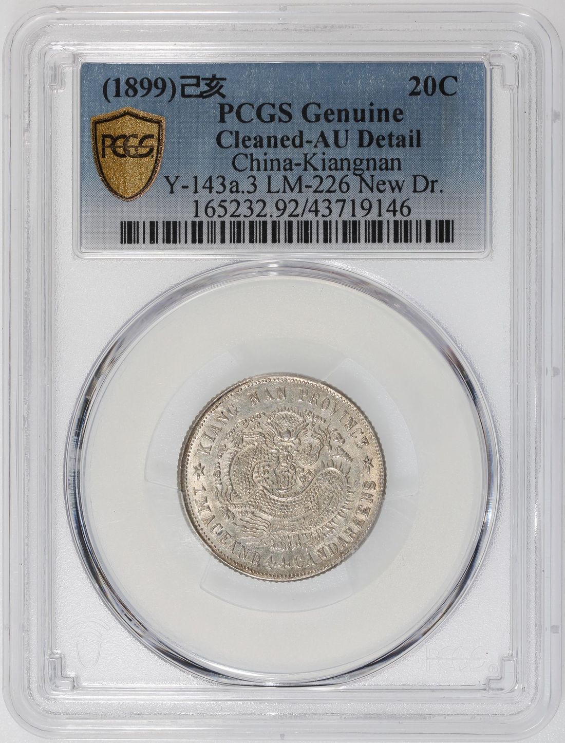 China, Qing Dynasty, Kiangnan Province, [PCGS AU Detail] silver 20 cents, Guangxu Yuan Bao, Jihai Year (1899), small dragon, (LM-226), rare type. Cert.# 43719146