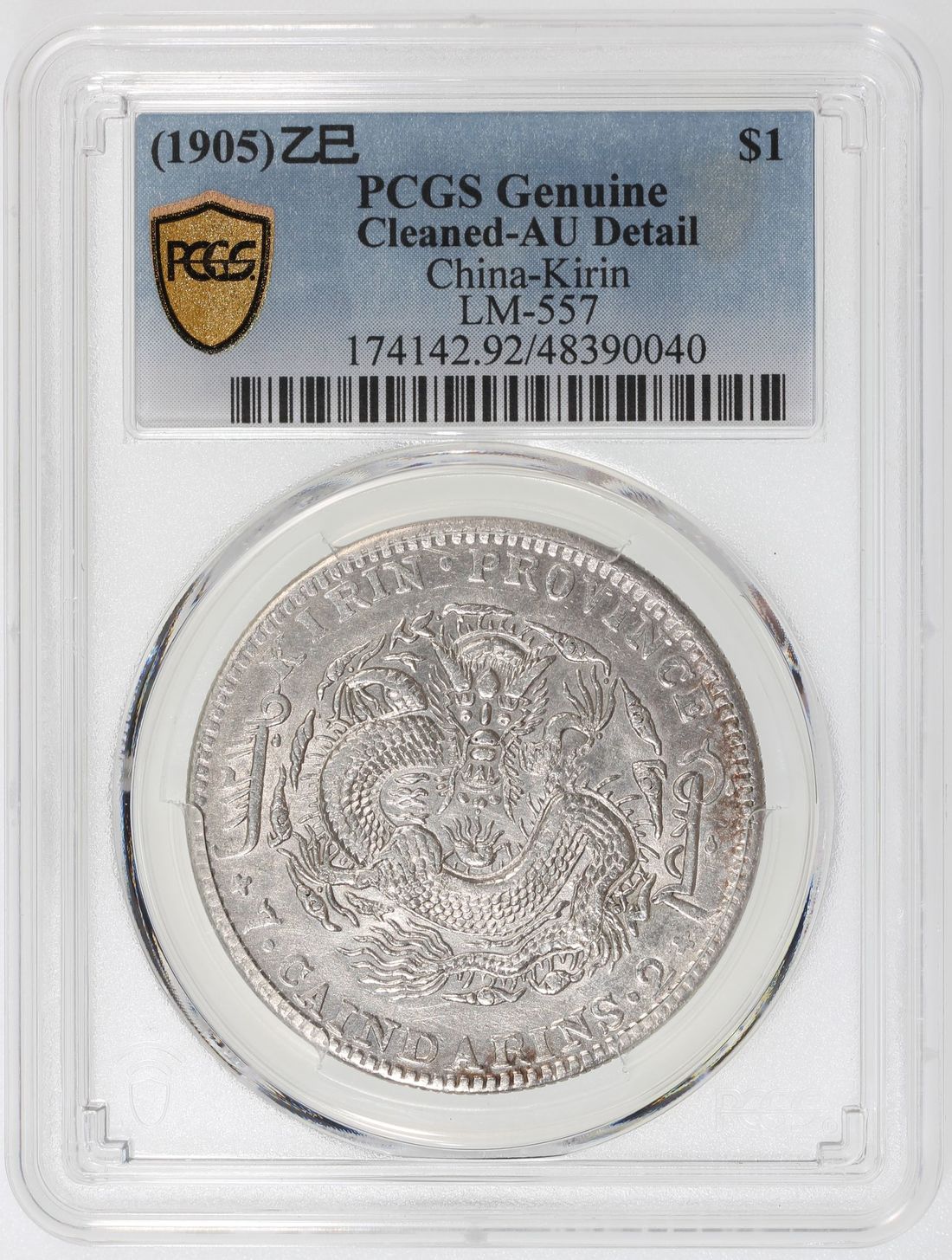China, Qing Dynasty, Kirin Province, [PCGS AU Detail] silver dollar, Guangxu Yuan Bao, Yisi Year (1905), (LM-557), cleaned. Cert.# 48390040