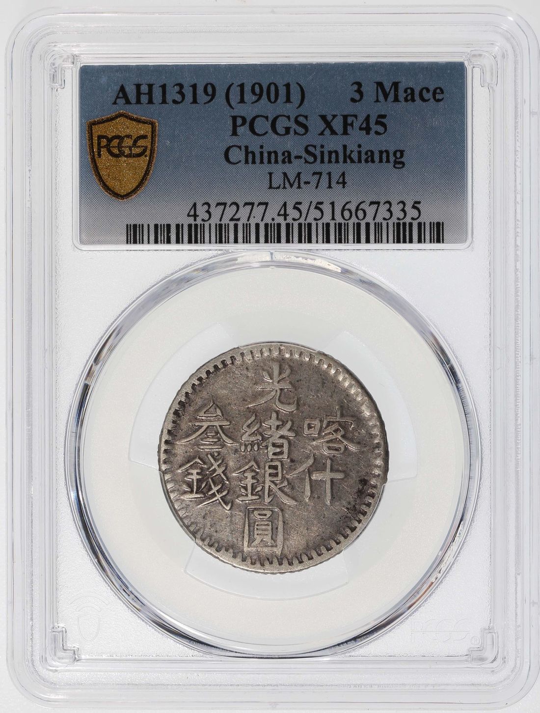 China, Qing Dynasty, Sinkiang Province, a pair of silver 3 mace, AH1319(1901), Guangxu Yin Yuan, Kashgar mint, (LM-714), one toned, the other PCGS XF45.(2)